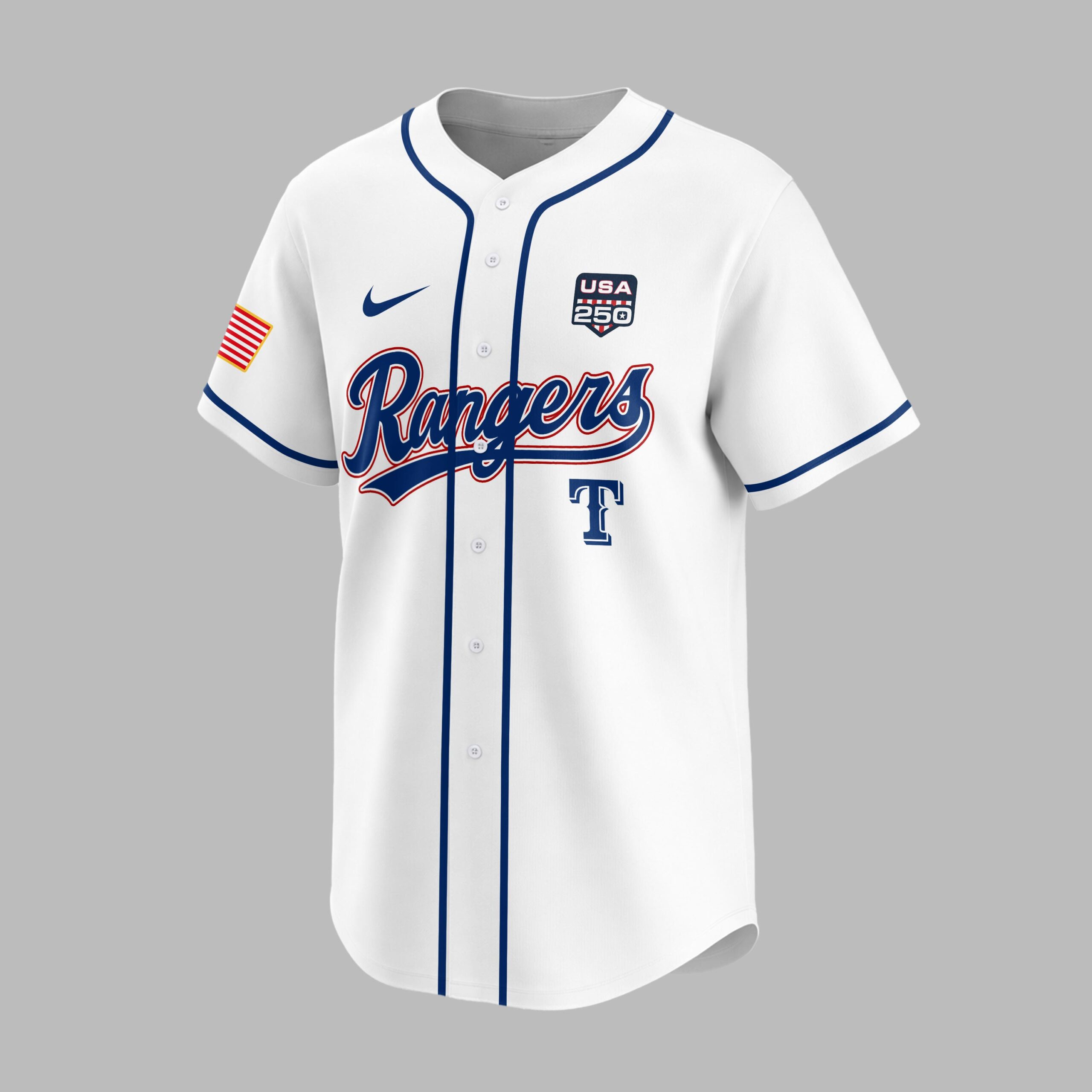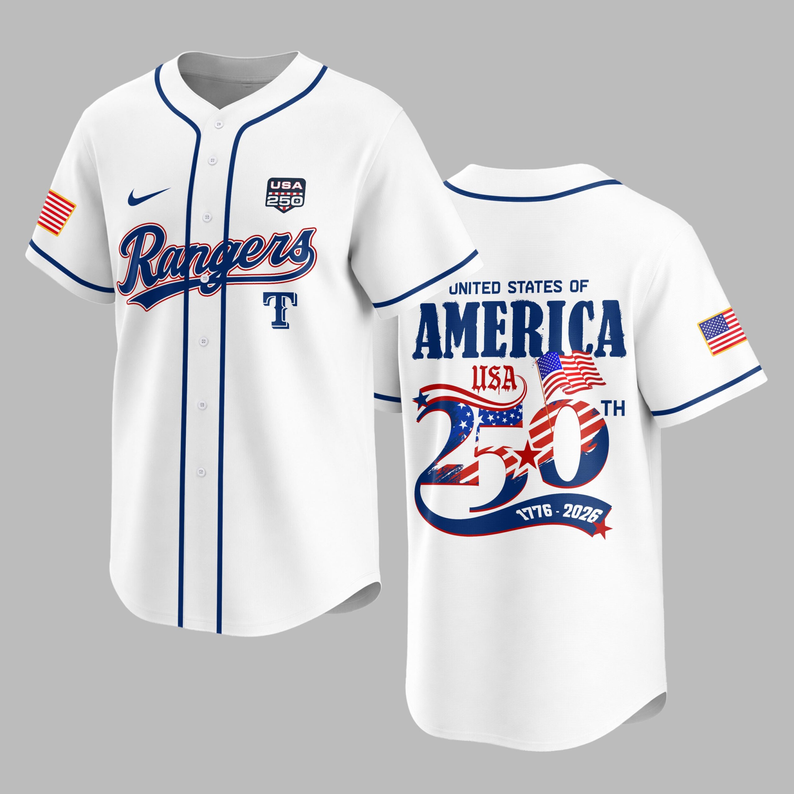 Show your American spirit and Rangers pride with this commemorative baseball jersey, honoring a pivotal milestone in U.S. history. This shirt celebrates the nation’s 250th anniversary, blending team devotion with heartfelt patriotism. The front features Rangers in a timeless script with a striking outline, enhanced by an American flag patch on the sleeve and a USA 250 emblem. The back showcases UNITED STATES OF AMERICA above a USA 250TH graphic, vividly incorporating the Stars and Stripes, completed by the historic 1776 – 2026 dates. This jersey is ideal for cheering at the ballpark, celebrating patriotic holidays like the Fourth of July, or simply expressing national pride. Wear it to parades, casual outings, or any occasion to boldly display your American spirit and support for the Rangers.