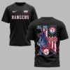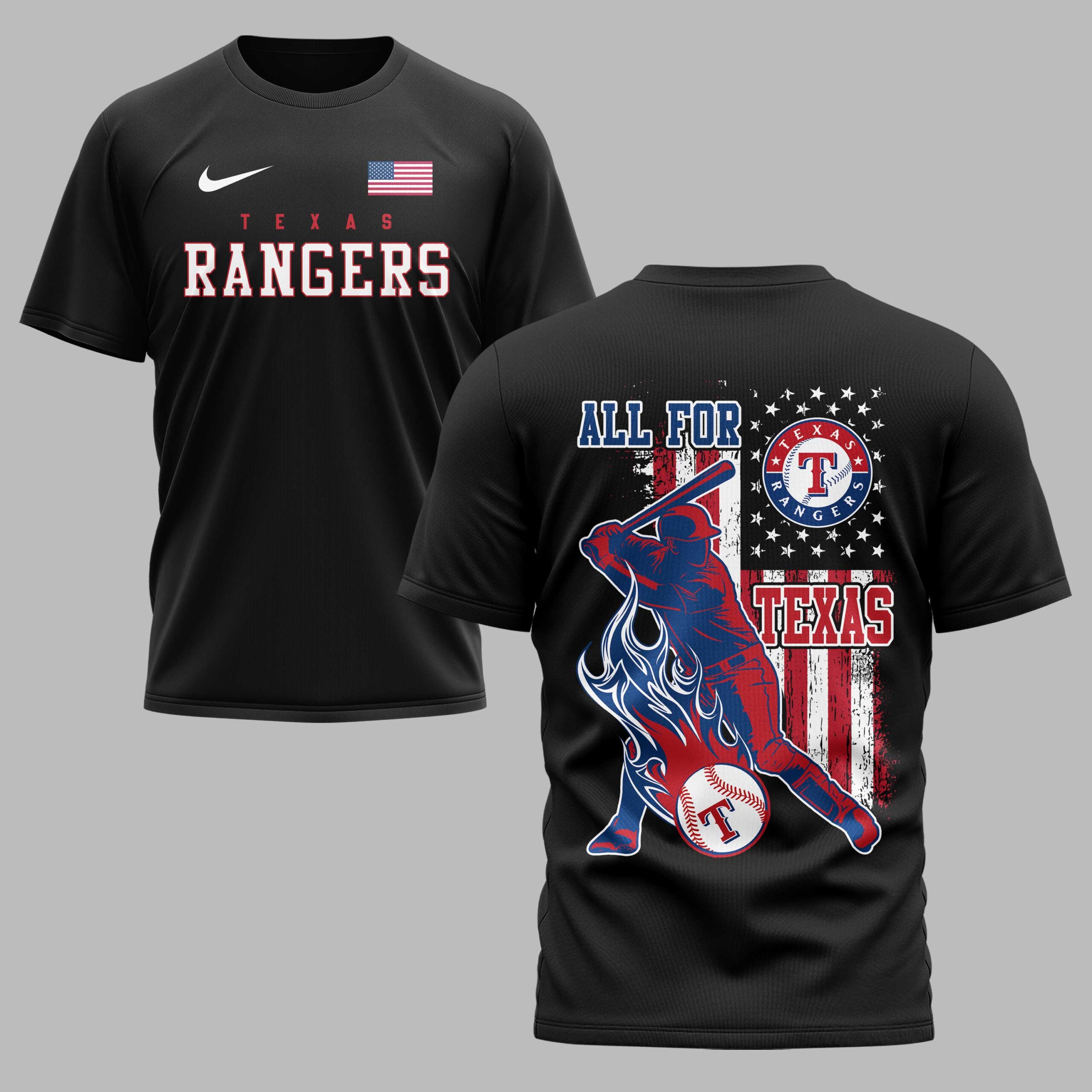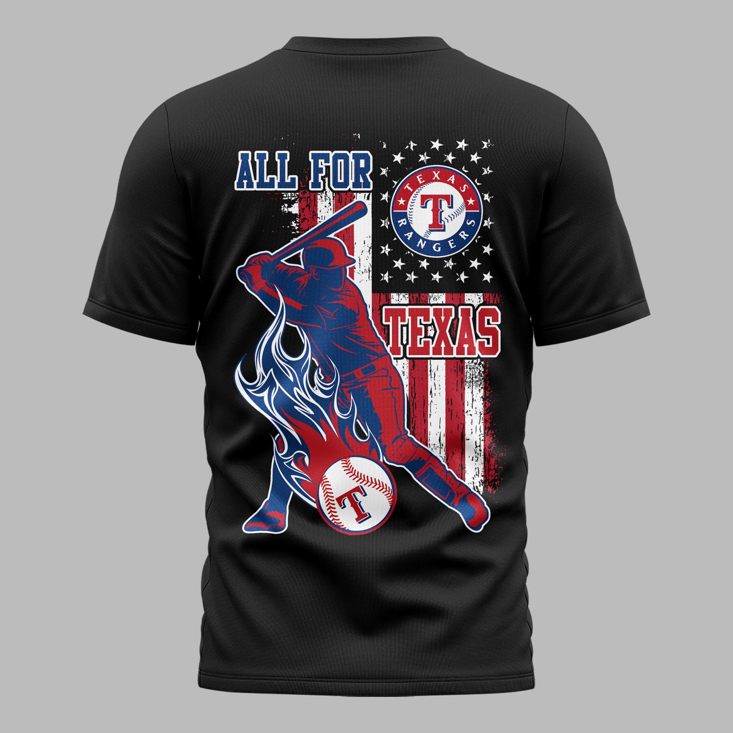 Showcase your unwavering Texas Rangers pride with this electrifying baseball fan t-shirt! Perfect for loyal supporters who live and breathe baseball, this tee embodies the spirit of game day and American patriotism. Get ready to cheer on your favorite team with bold style and a strong sense of national pride. The front of this vibrant blue shirt proudly displays TEXAS RANGERS in striking white lettering with a red outline, complemented by a subtle American flag on the left shoulder. The back features an impressive distressed American flag design, serving as the backdrop for a dynamic baseball player mid-swing. Flames burst around the player and baseball, while ALL FOR and TEXAS text frame a classic circular Texas Rangers logo, completing this powerful visual statement. Whether you’re heading to Globe Life Field, watching the game with friends, or simply want to represent your team every day, this shirt is your go-to. It’s ideal for sporting events, Fourth of July celebrations, or any casual outing where you want to display your love for Texas baseball and country.