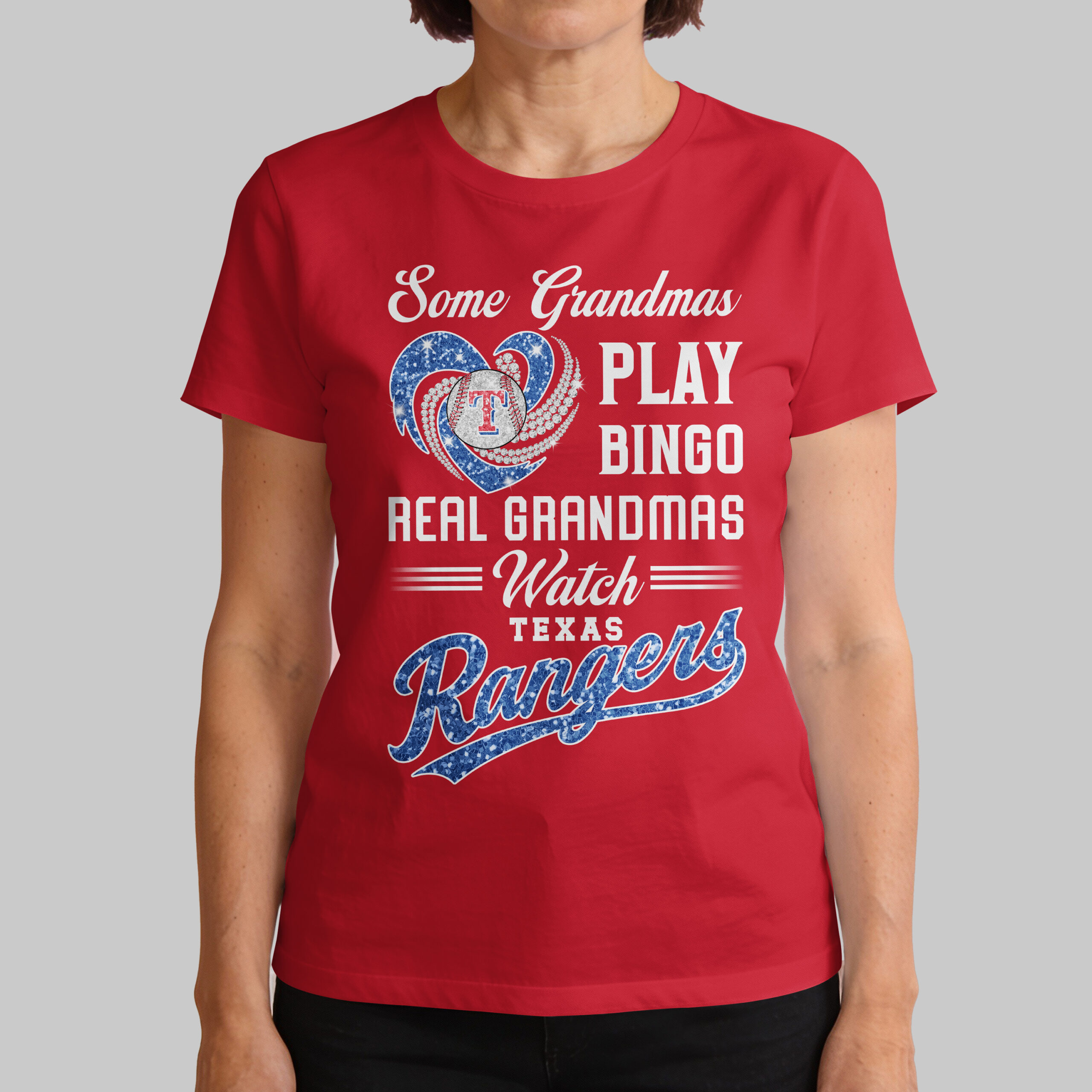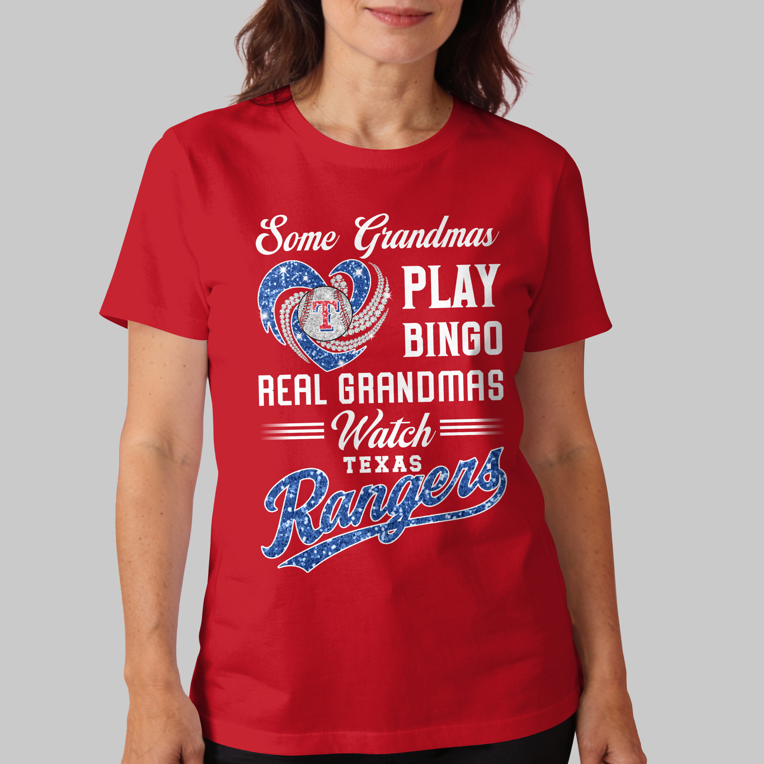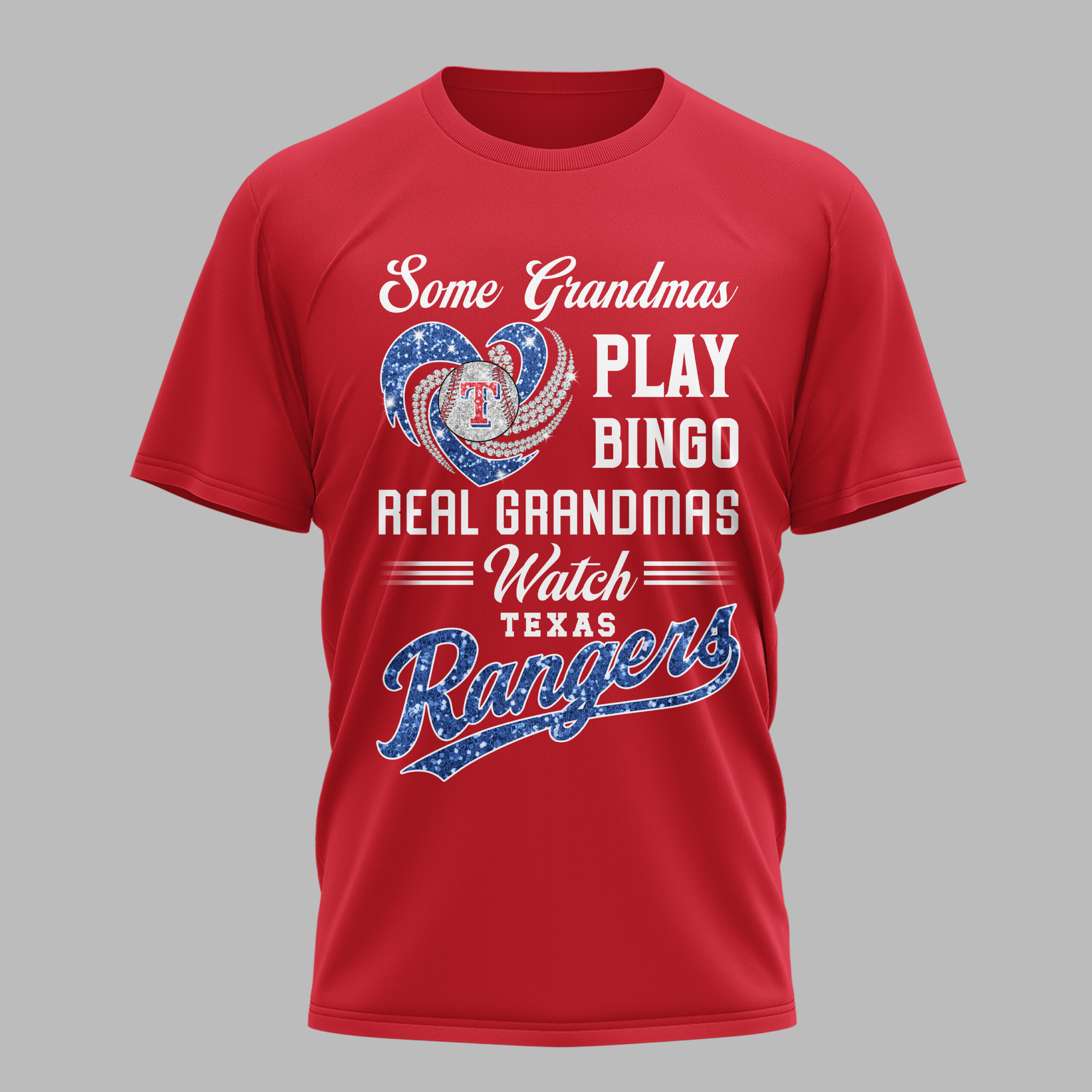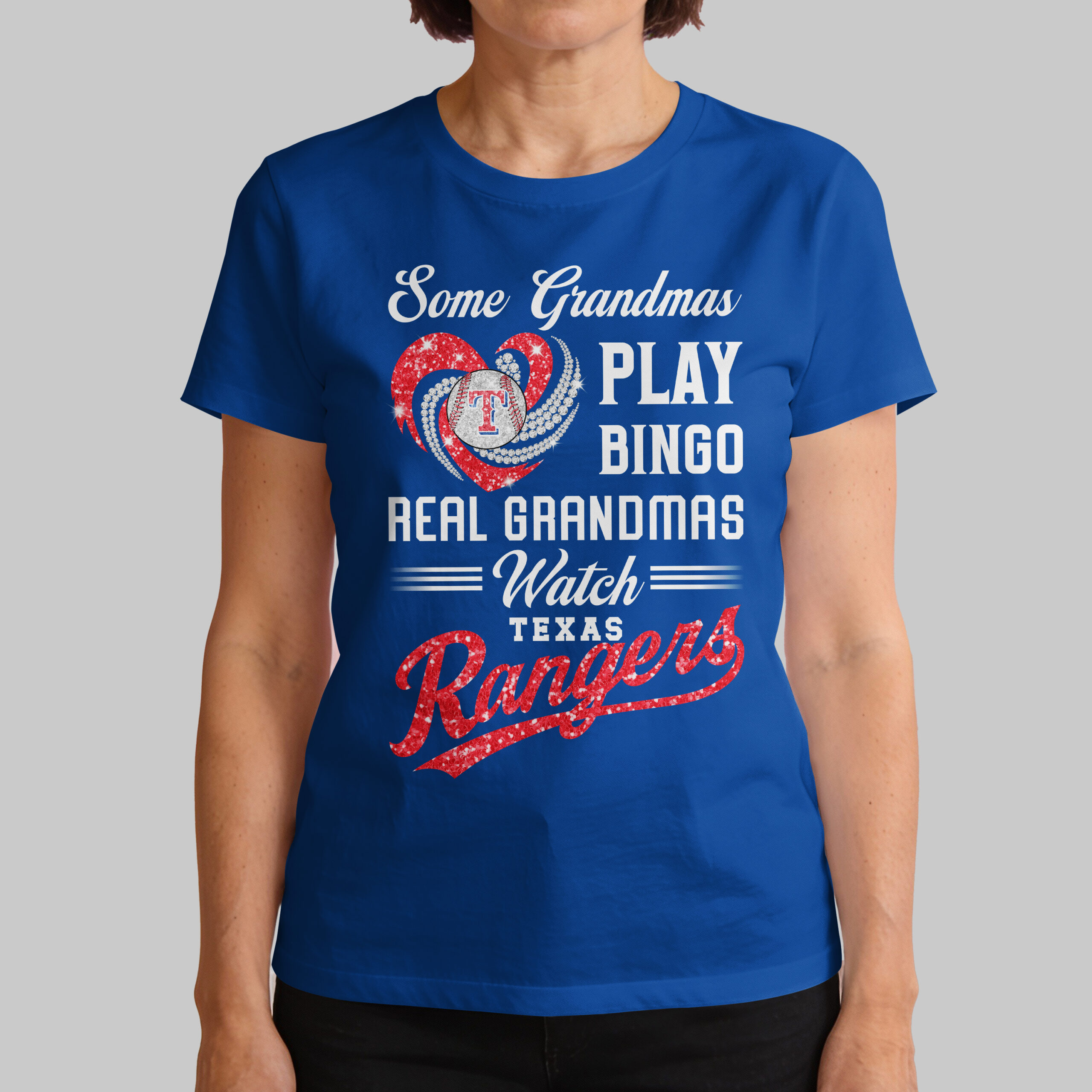 Celebrate your Texas Rangers pride and grandma spirit with this vibrant tee! Perfect for the devoted grandmother, this shirt boldly declares your allegiance. Let everyone know your heart is with the Rangers on game day! This eye-catching blue shirt features a dazzling front design. A sparkling red heart, with brilliant white swirls, cradles a baseball with the iconic Texas Rangers T logo. Below, the playful message Some Grandmas PLAY BINGO REAL GRANDMAS Watch TEXAS Rangers is displayed, with Rangers shining in glittery red script. Wear this spirited shirt to game days, watch parties, or daily. It’s an ideal gift for Mother’s Day, birthdays, or any occasion for the baseball-loving grandma.