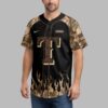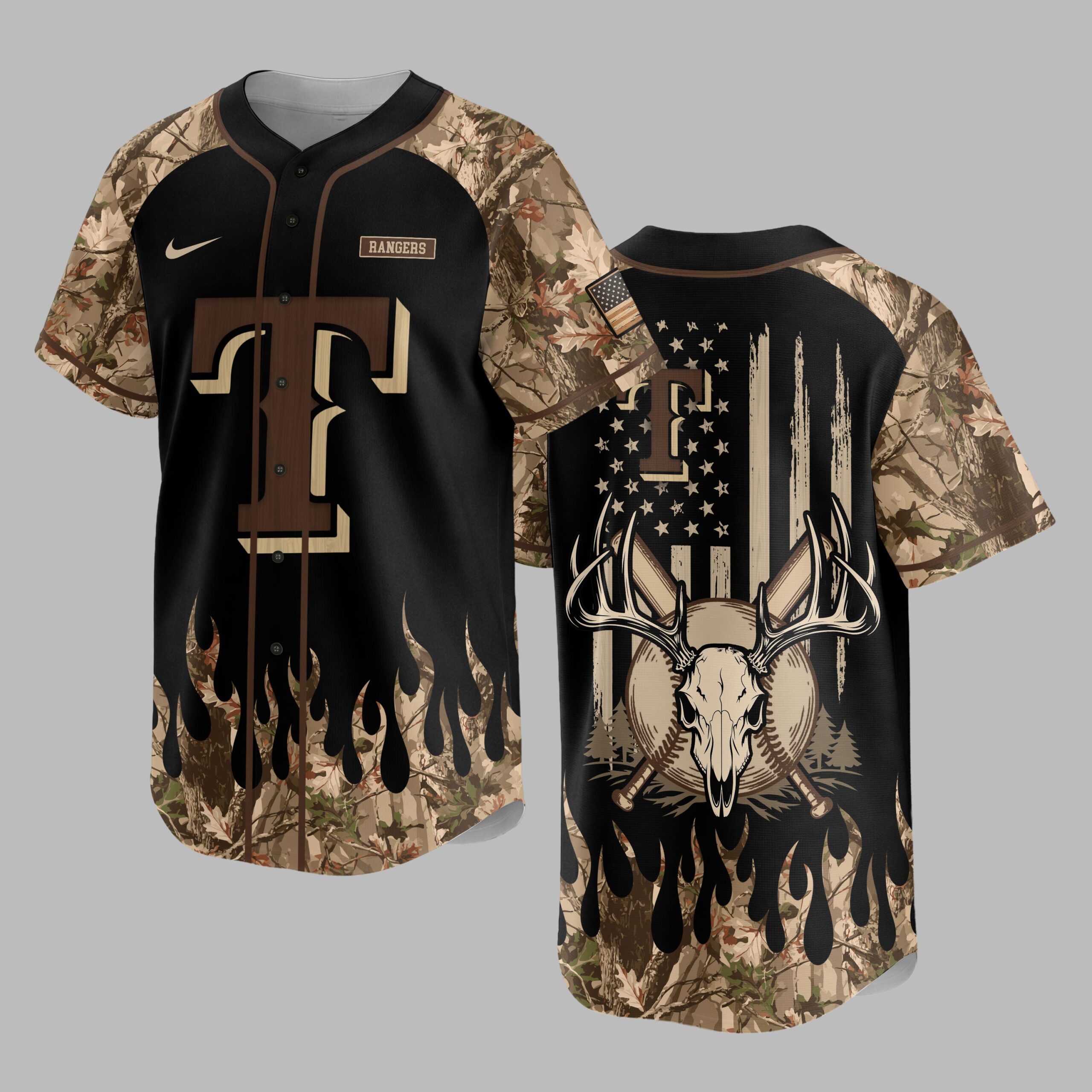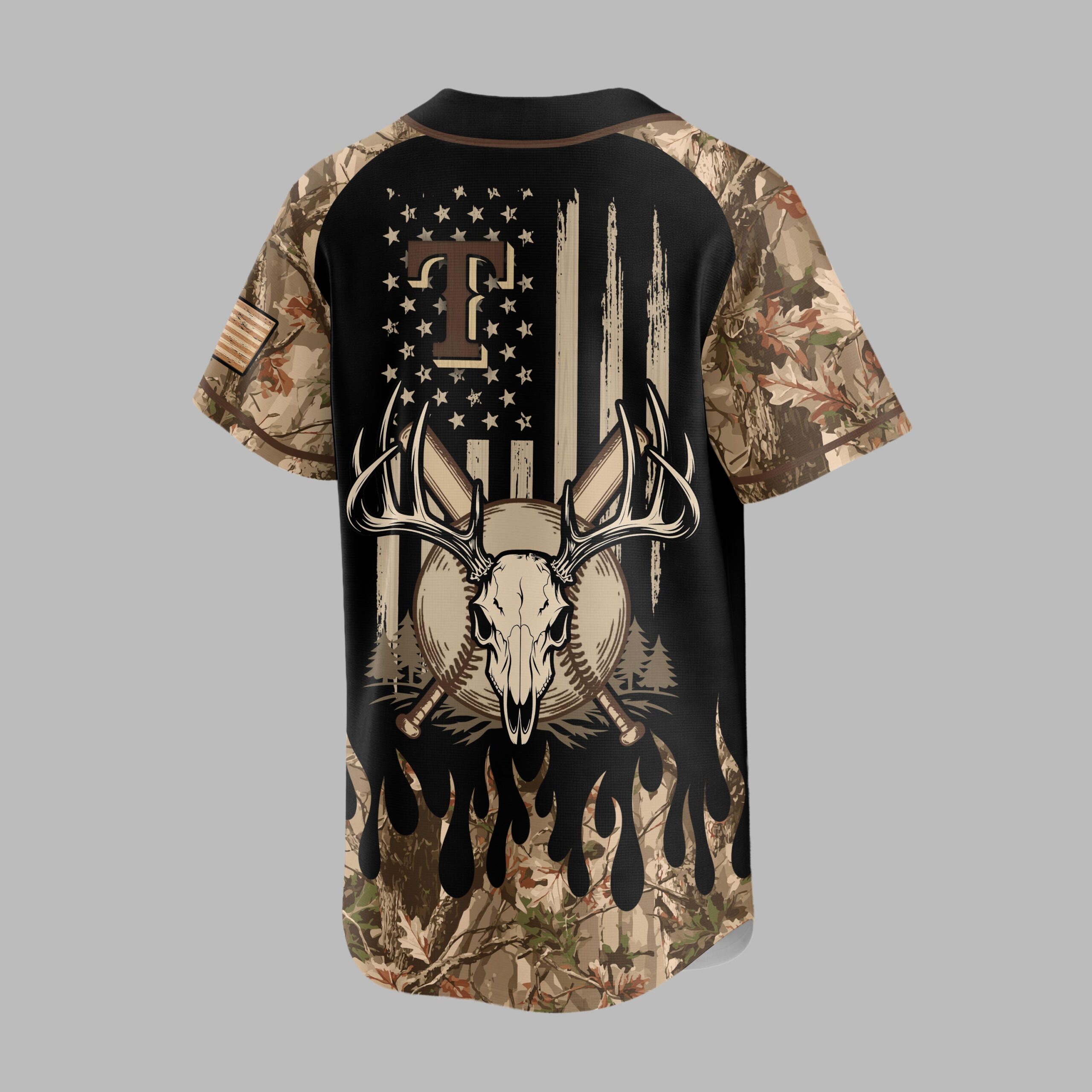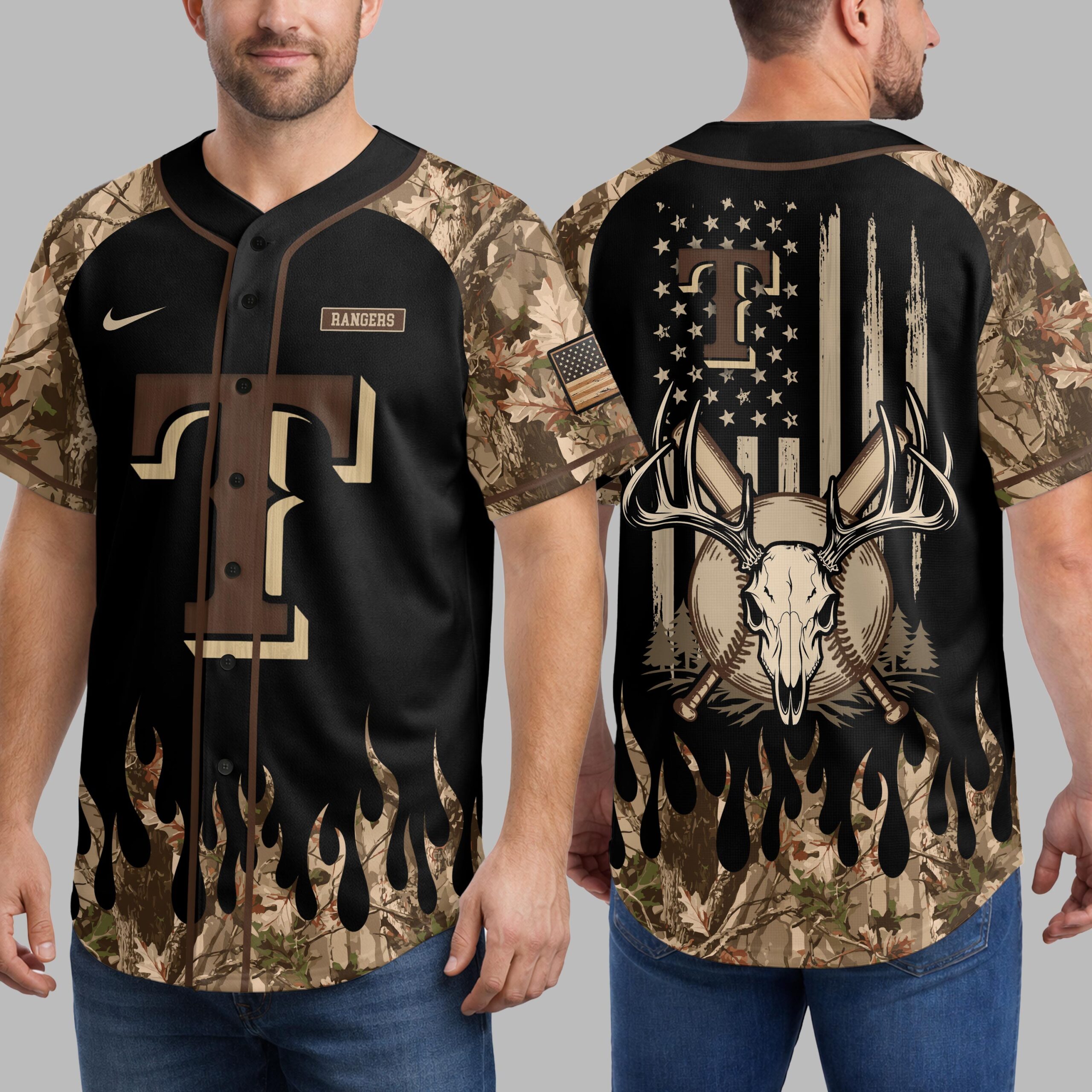 Display your Texas Rangers pride with this unique baseball jersey, blending team spirit with a rugged outdoor and patriotic flair. It’s designed for fans who embrace both the excitement of the game and the call of the wild, making a bold statement. The front features a wood-grain textured T against a black body, framed by camouflage sleeves merging into a flame design along the sides. The back showcases a distressed American flag background, highlighting the matching wood-grain T, a powerful deer skull with antlers, and crossed baseball bats, accented by pine trees. An American flag patch adorns the sleeve. Perfect for game day, outdoor excursions, or simply showcasing your patriotism and passion, this jersey is a standout. Celebrate your team, your nation, and your adventurous spirit with style and comfort.