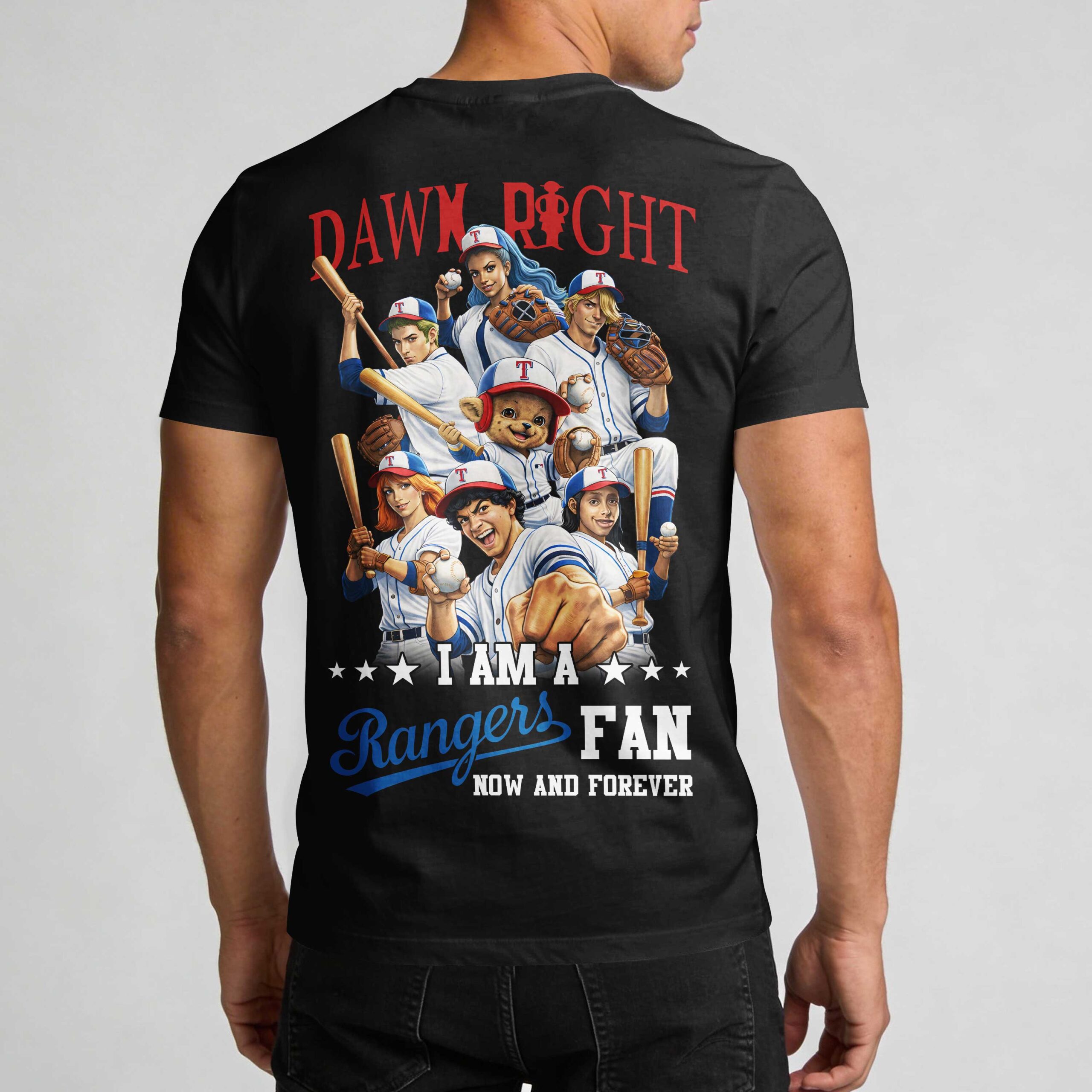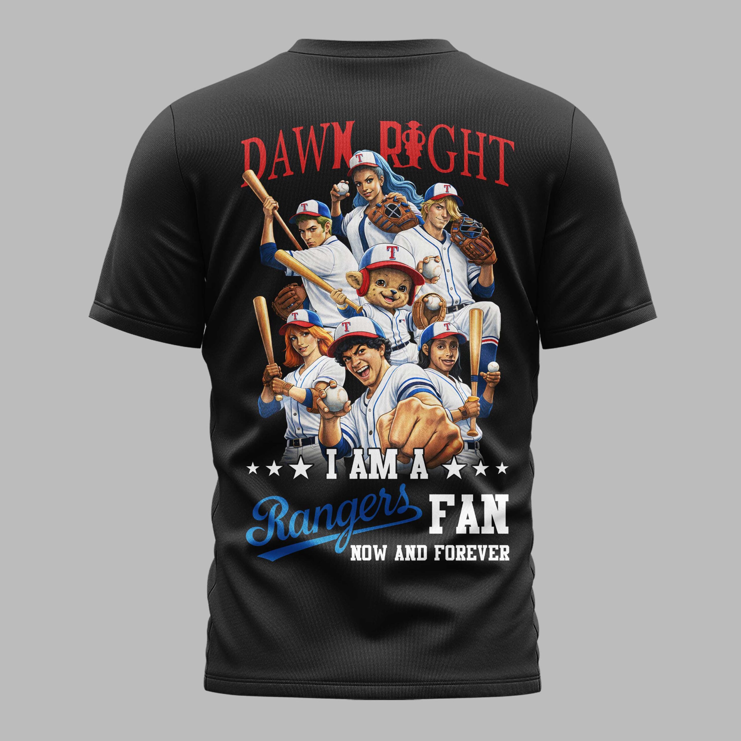 Show off your deep-rooted Texas Rangers pride and celebrate a historic milestone with this striking fan T-shirt. Designed for dedicated supporters in the Lone Star State, this shirt blends classic team spirit with a bold, celebratory theme that honors the American spirit of independence. Whether you’re at the stadium or a backyard BBQ, this tee makes a powerful statement about where your loyalty lies. The front features a unique Texas Rangers wordmark paired with a creative skull and crossbones emblem. The back is truly impressive, featuring an epic Dawn Right graphic with an ensemble of characters in team uniforms. Finished with the proud declaration, I AM A Rangers FAN NOW AND FOREVER, it captures the energy of the game and the bond of the fan community perfectly. This is the ultimate choice for game day at the ballpark, Independence Day celebrations, or everyday fan wear. It’s ideal for cheering during a big series or showing your colors at a summer gathering. Represent your team with honor and style all season long.