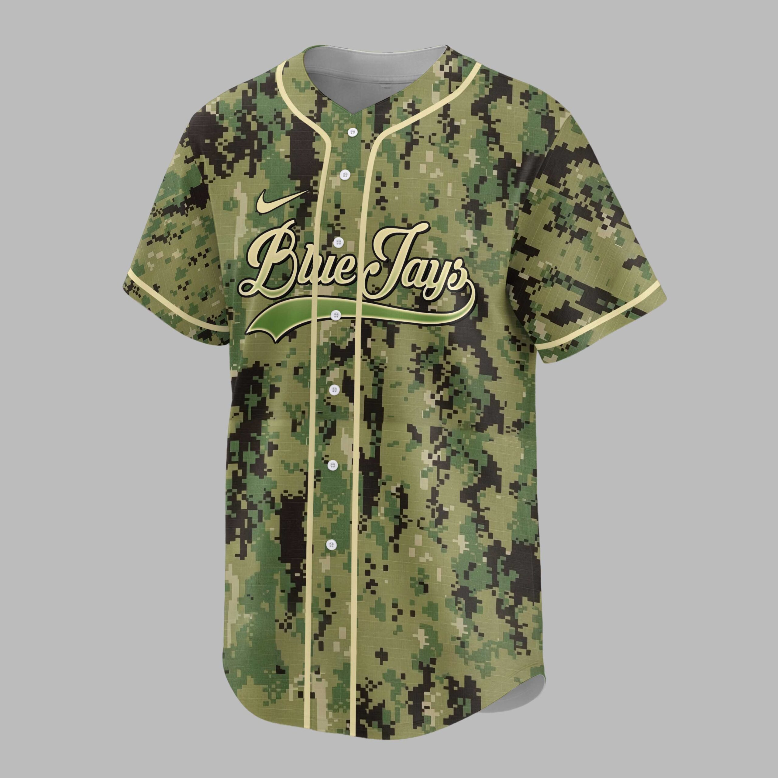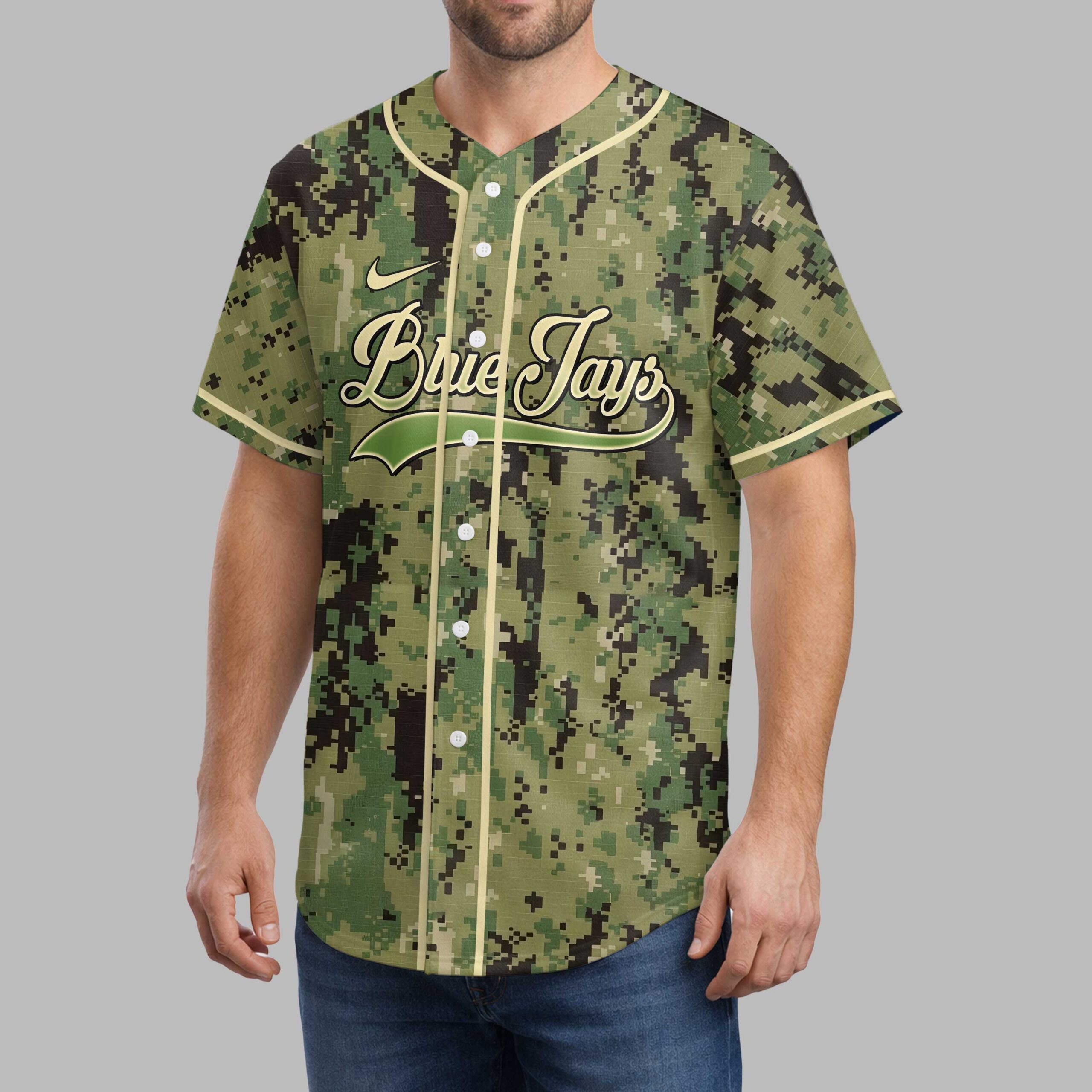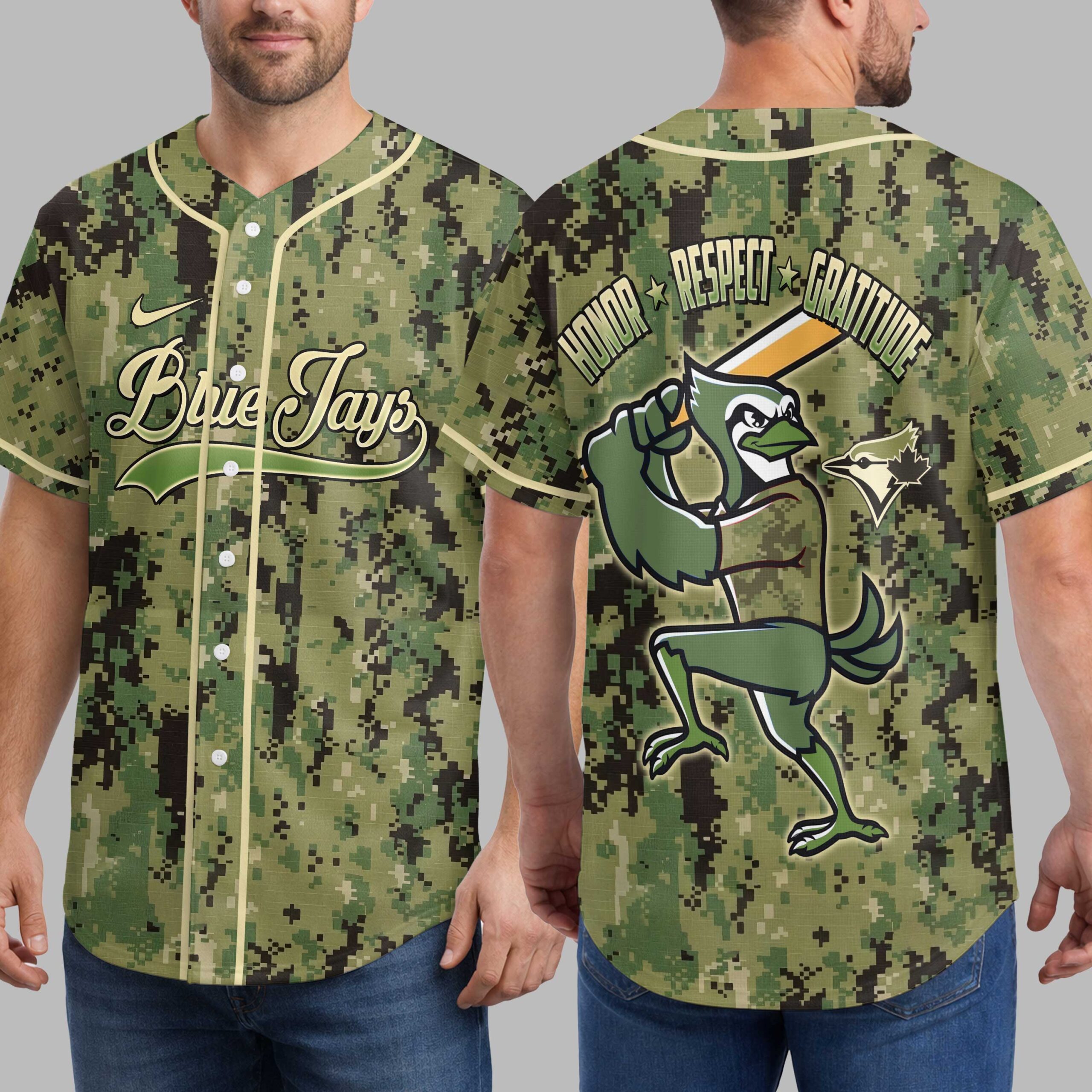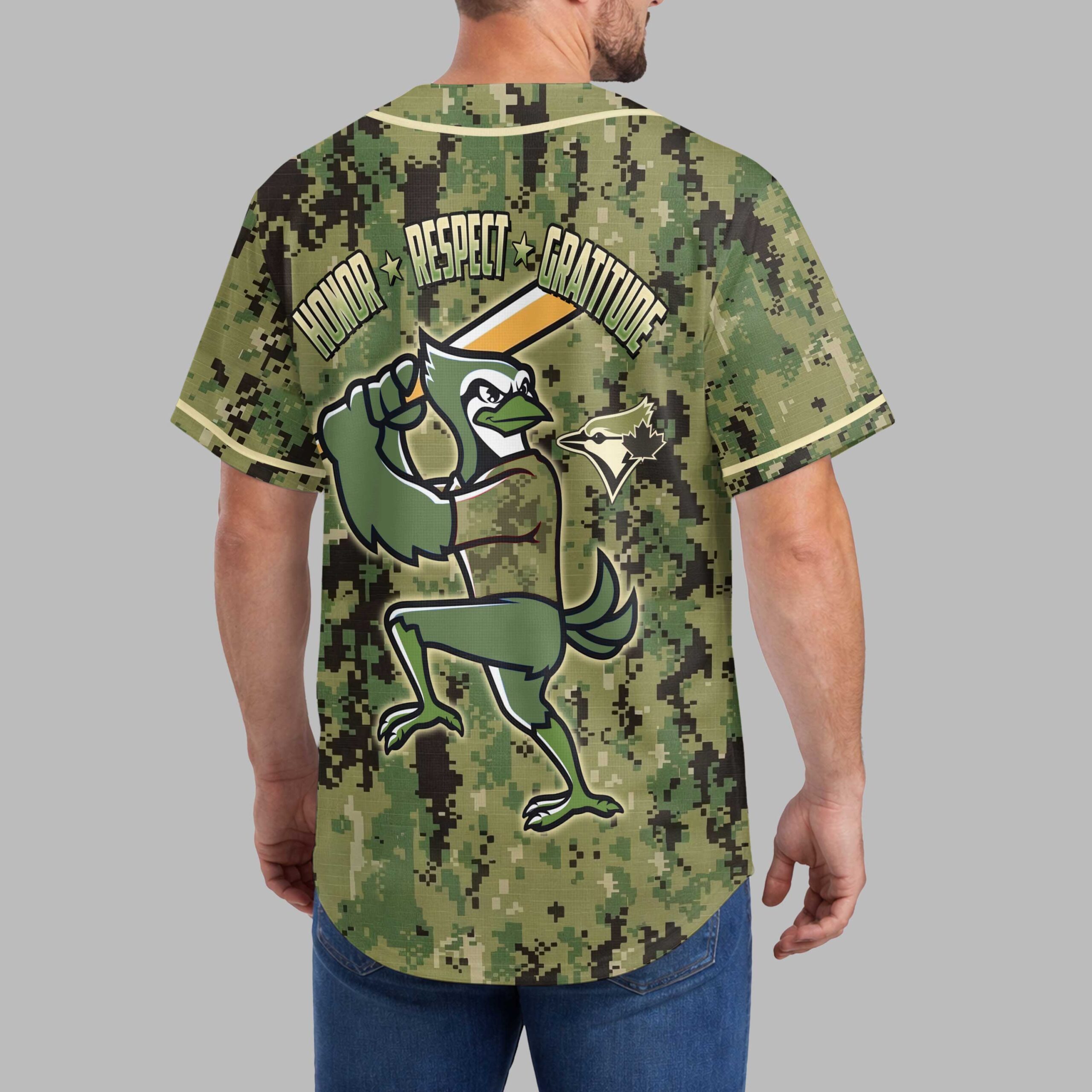 Show your unwavering support for the Blue Jays and salute those who serve with this unique military-inspired baseball jersey. This design perfectly blends team spirit with a profound message of appreciation, making it a powerful statement of pride on and off the field. The front features the iconic Blue Jays script in a bold outline, set against a rugged digital camouflage pattern. Flipping to the back, a determined bird mascot in a batting stance dominates, surrounded by the powerful words HONOR, RESPECT, and GRATITUDE, adorned with patriotic stars. Perfect for game day at the ballpark, Memorial Day celebrations, Veterans Day events, or simply showing your national and team pride every day. This jersey is an exceptional way to combine your passion for baseball with a deep sense of respect.