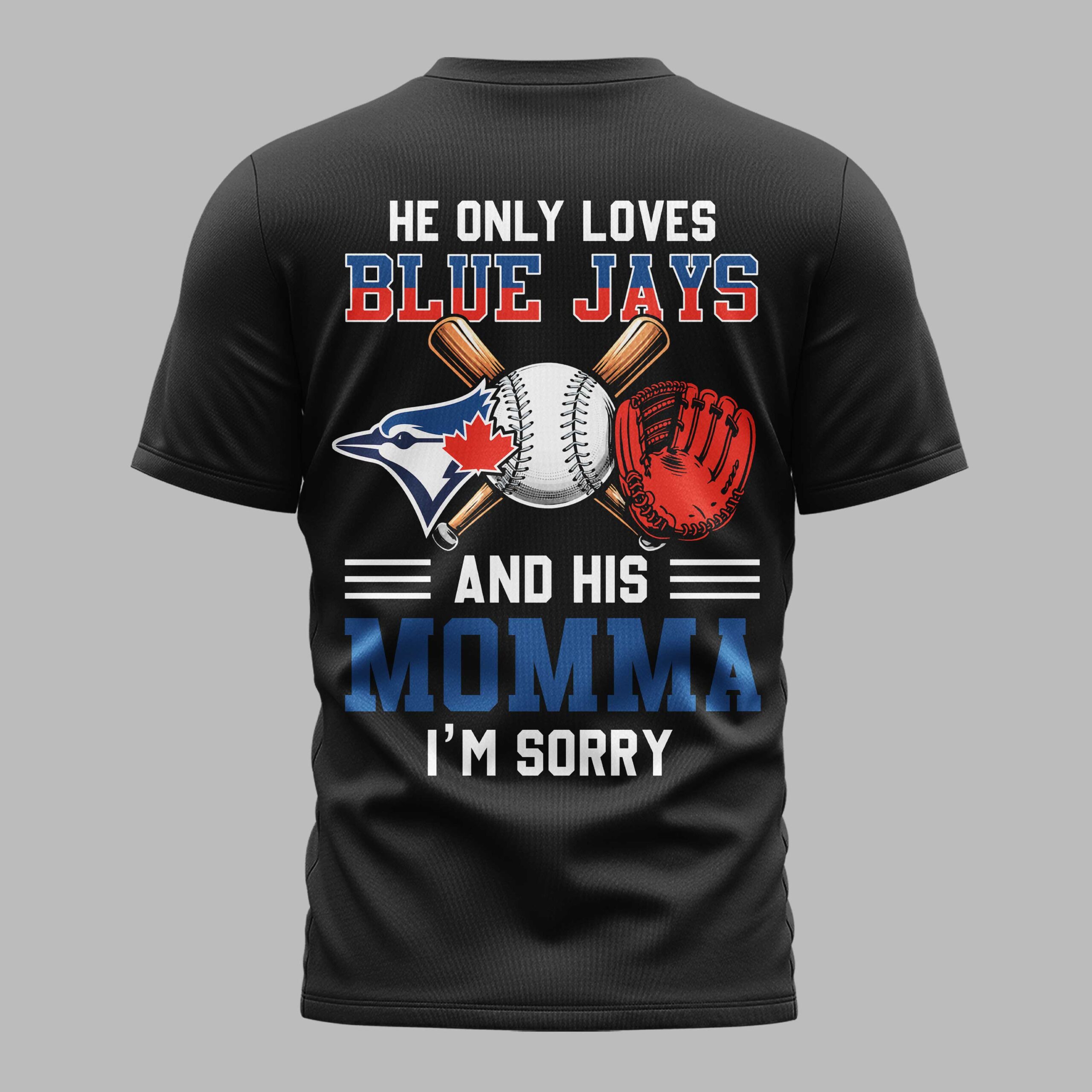 Step up to the plate and show your true colors with this Toronto Blue Jays fan tee. It’s the ultimate gear for fans who want to combine their passion for the game with a bold, celebratory look. This shirt captures the energy of the diamond and the pride of the team in one stylish design. The front commands attention with a large TORONTO wordmark and the iconic team logo. The back brings the personality, featuring a fun graphic that reads, HE ONLY LOVES BLUE JAYS AND HIS MOMMA I’M SORRY. Complete with crossed wooden bats, a crisp baseball, and a classic red glove, this design captures every detail of your fan identity. Perfect for game day, backyard celebrations, or just hitting the streets, this tee is built for the dedicated supporter. It’s a fantastic way to showcase your devotion, making it a must-have staple in any baseball fan’s wardrobe.
