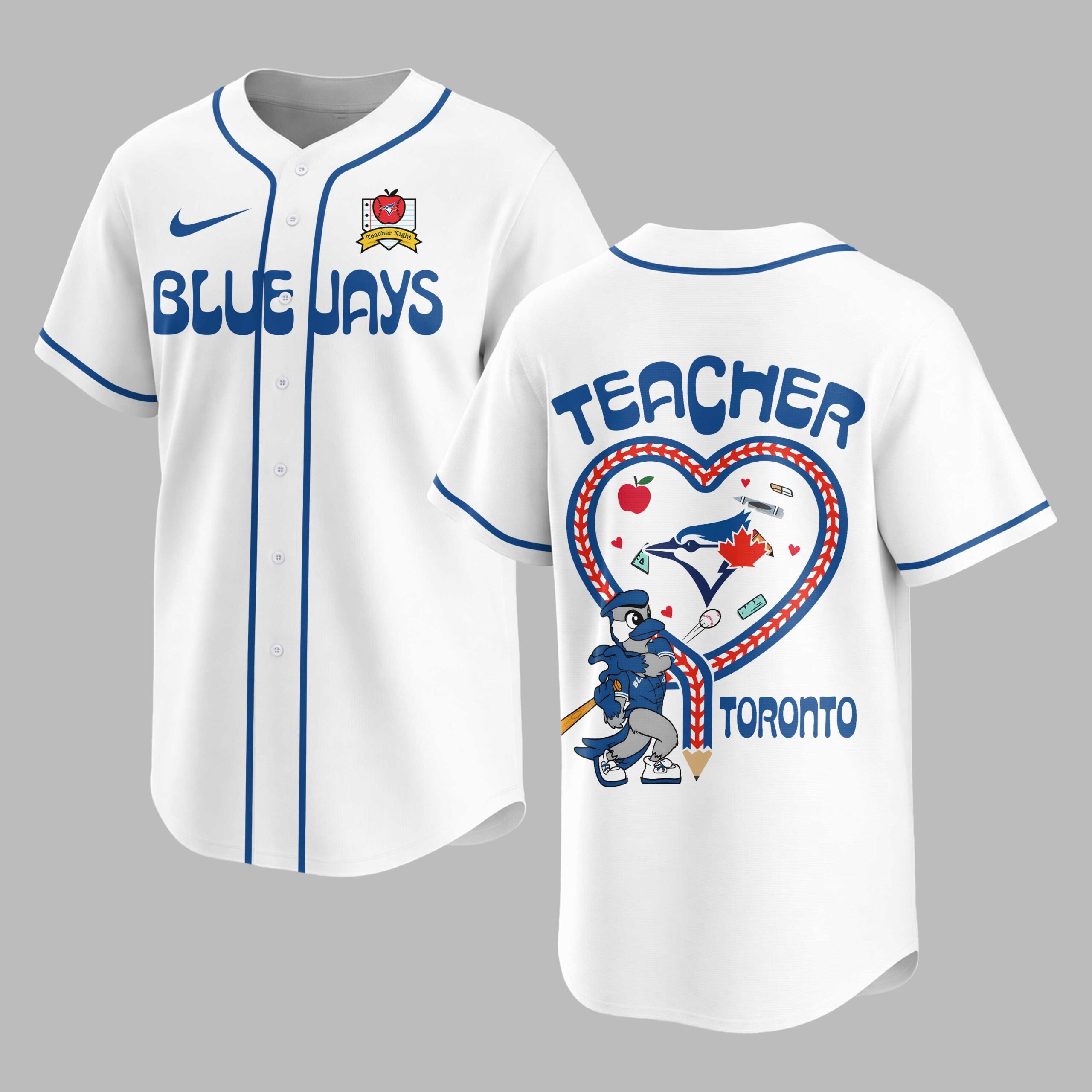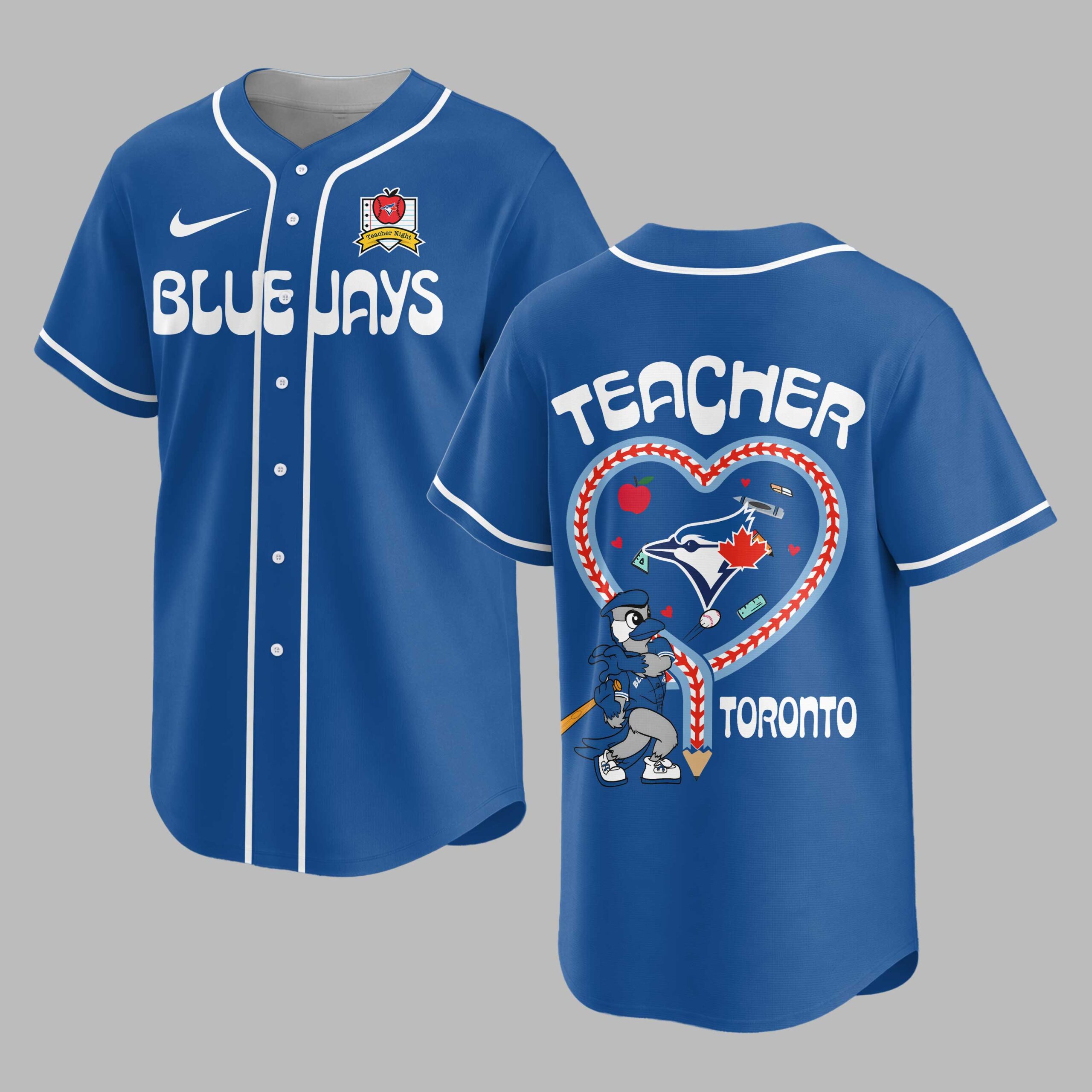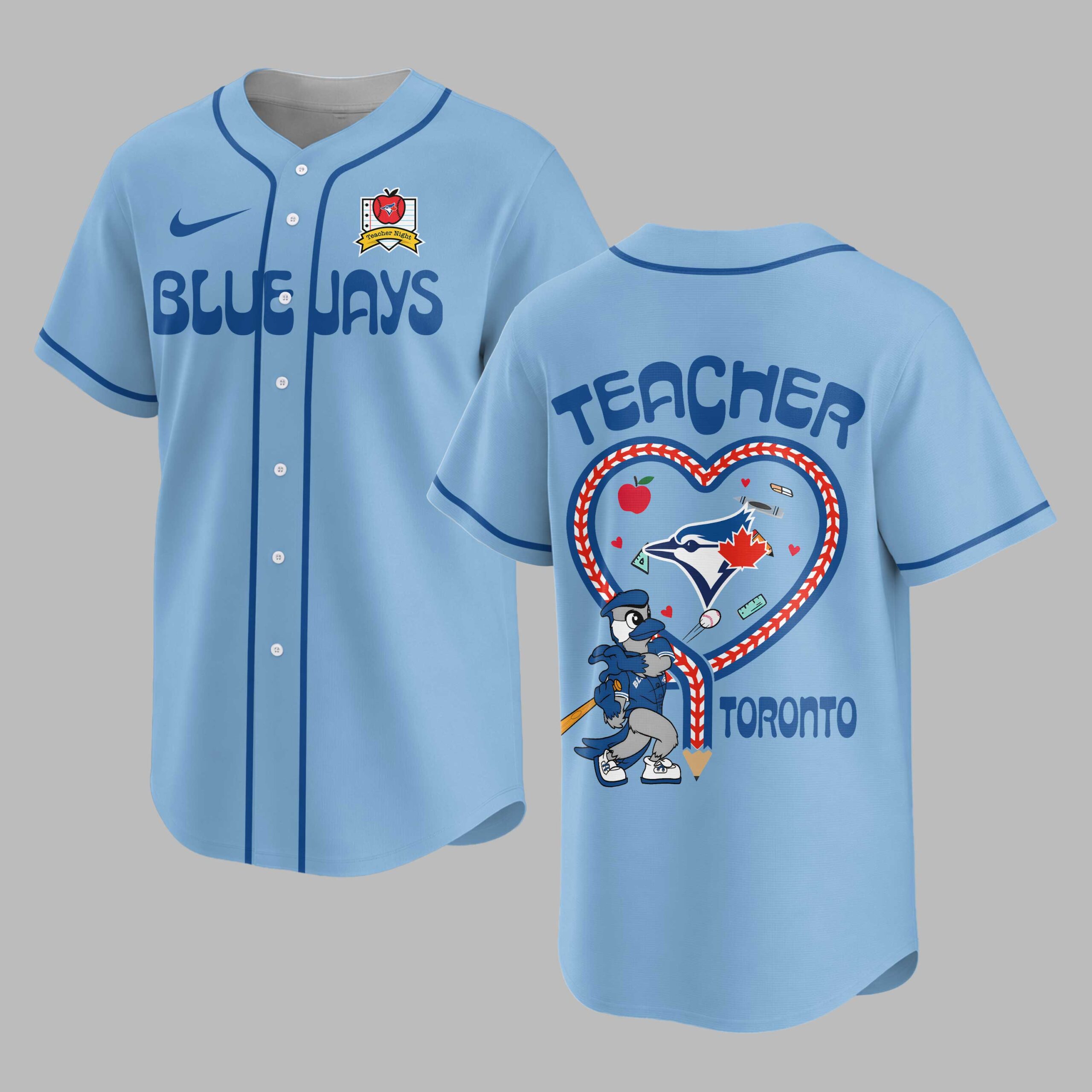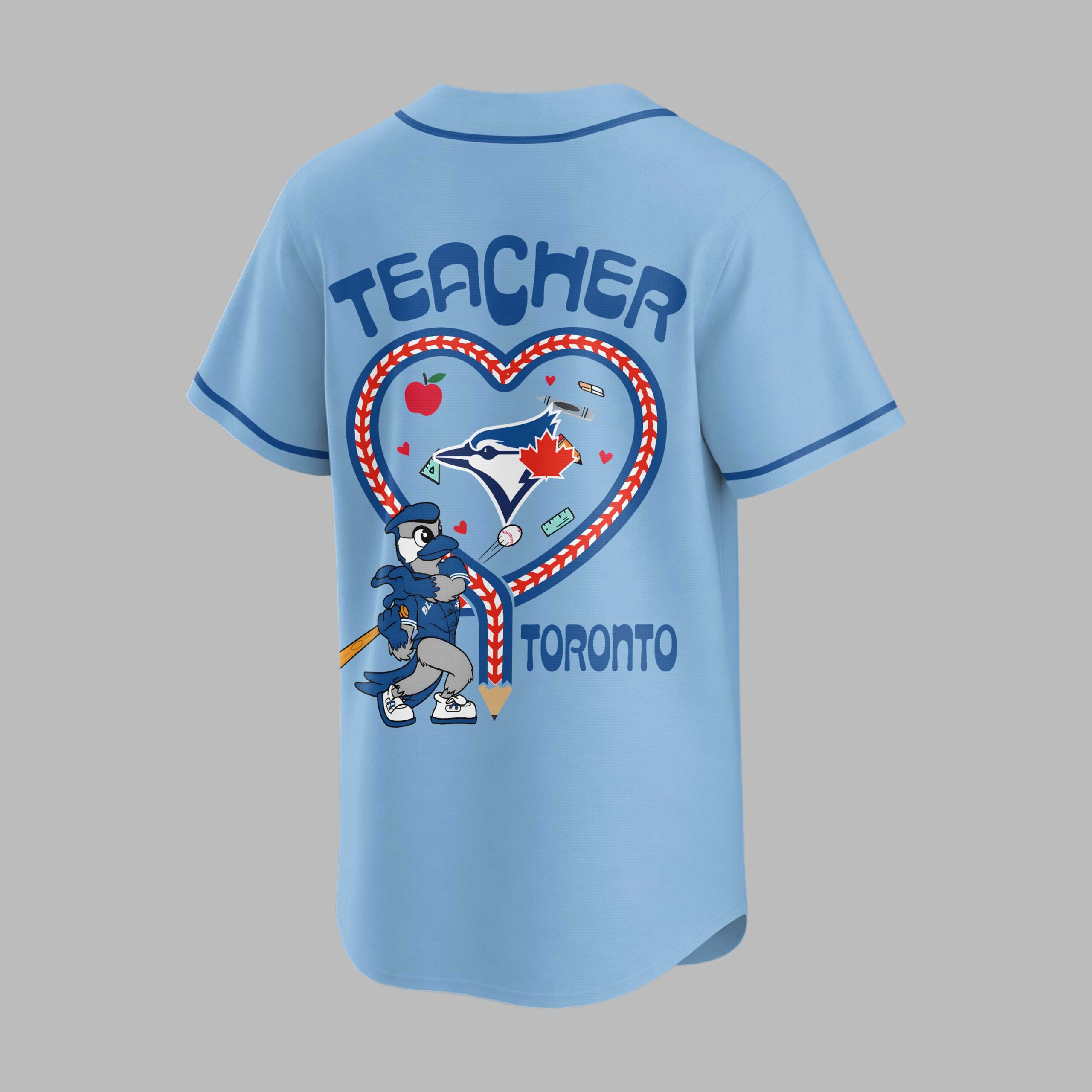 Celebrate your passion for both the Toronto Blue Jays and the noble profession of teaching with this unique baseball jersey! Perfect for educators who bleed blue, this shirt proudly displays your dual pride for your favorite team and your dedication to shaping young minds. The front of this vibrant blue jersey features the iconic BLUE JAYS text in crisp white, along with a special Teacher Night patch, blending team spirit with academic honor. Turn around to reveal a heartwarming design on the back: TEACHER emblazoned above a captivating heart. This heart is artfully outlined with baseball stitching and filled with delightful elements like the Blue Jays logo, an apple, a baseball, and various school supplies, all crowned by an energetic Blue Jays mascot ready to hit a home run, with TORONTO below. Wear this spirited jersey to teacher appreciation games, school events, or simply while out and about to showcase your love for Toronto baseball and your incredible profession. It’s a fantastic way to unite your community spirit with your professional pride, making it a standout piece for any devoted Blue Jays fan who is also an educator!