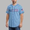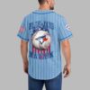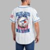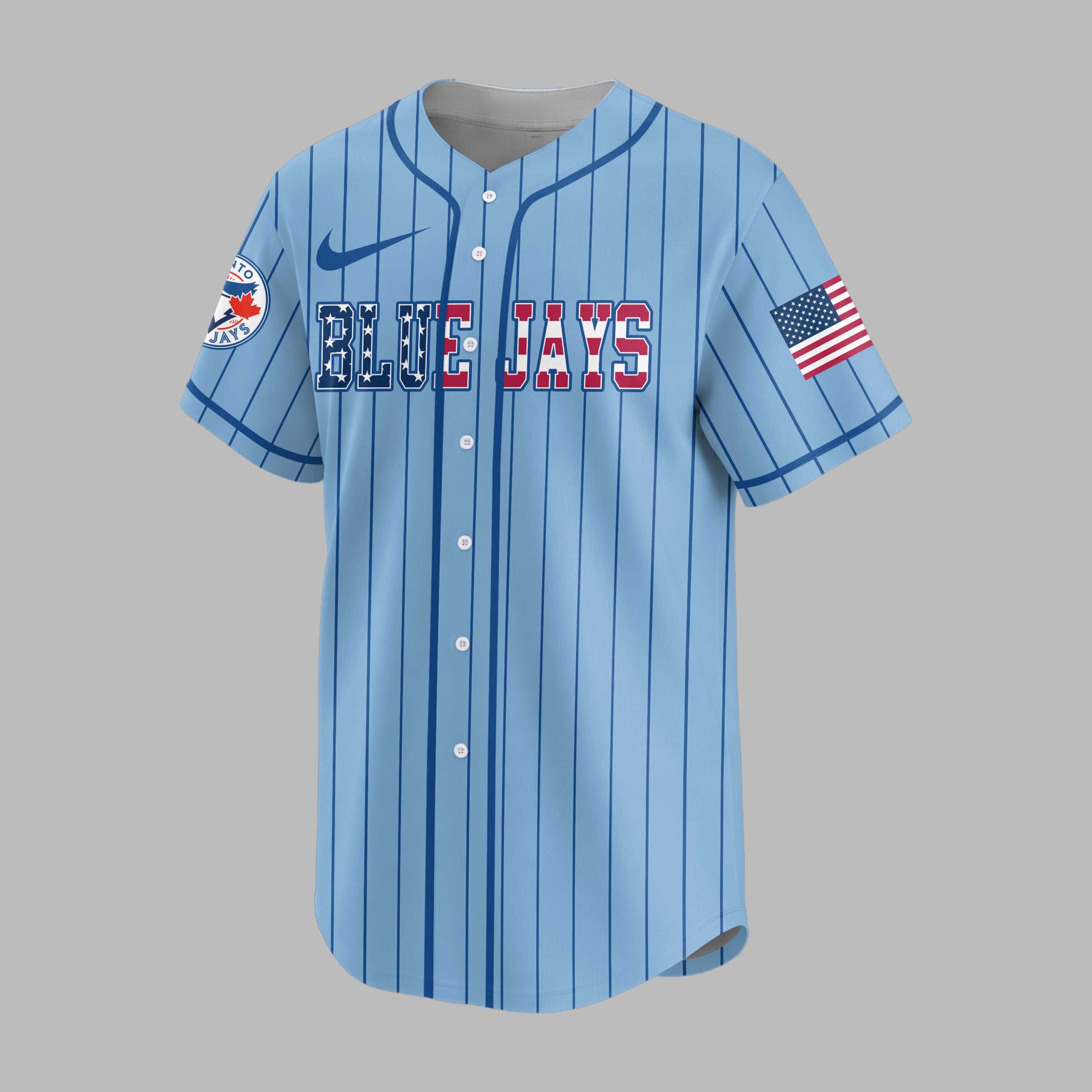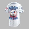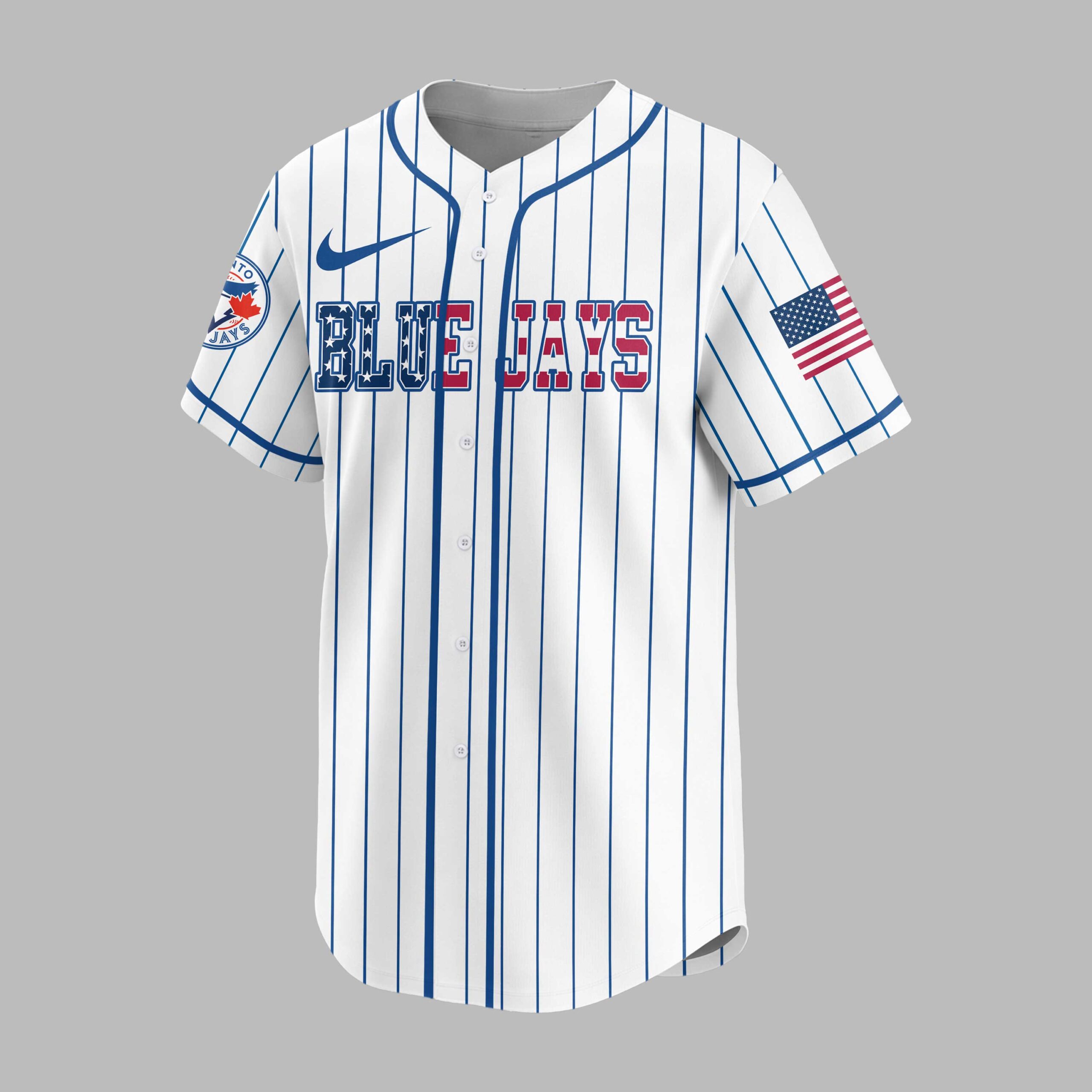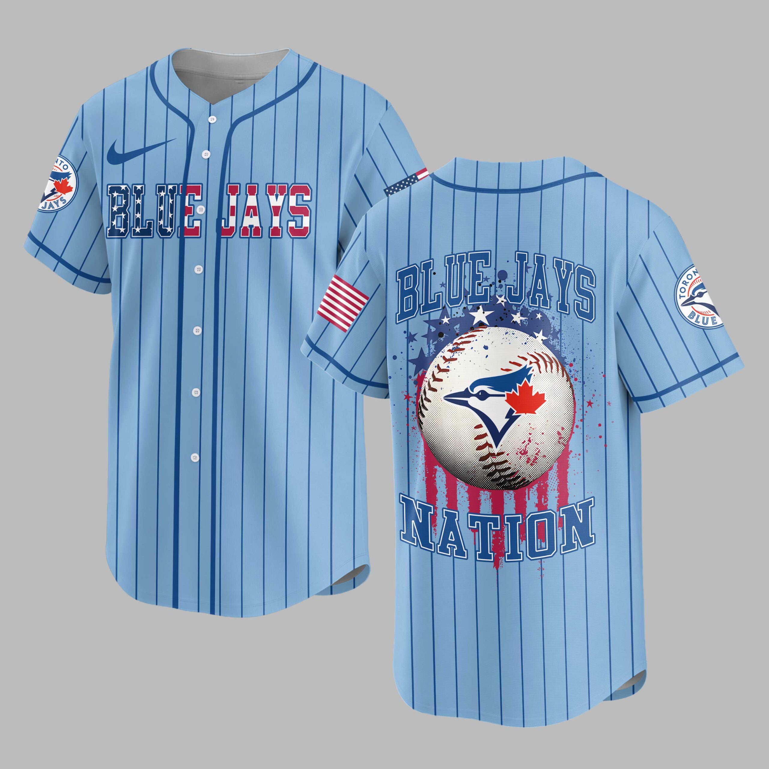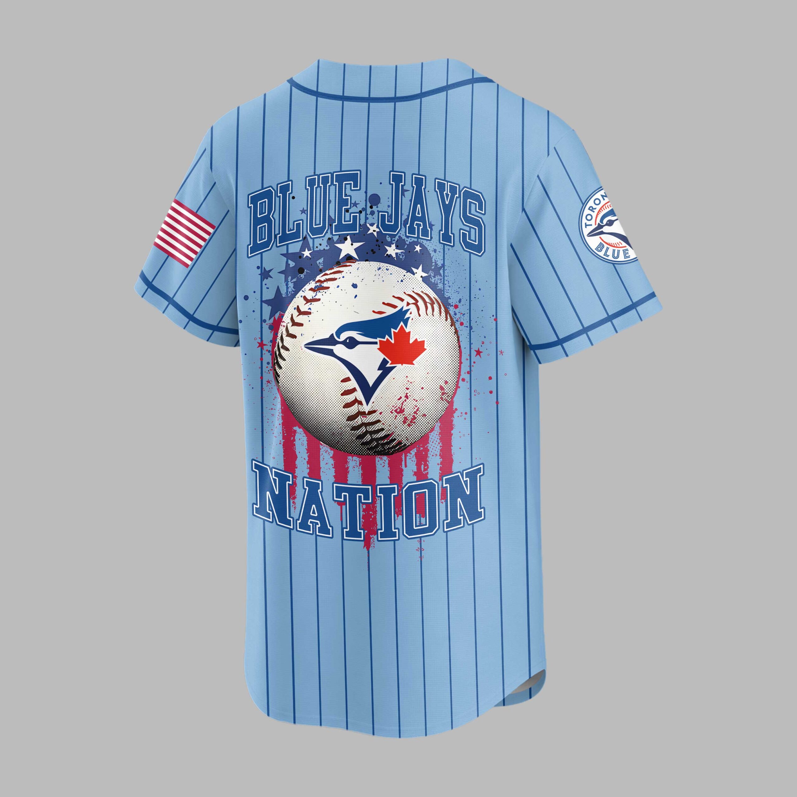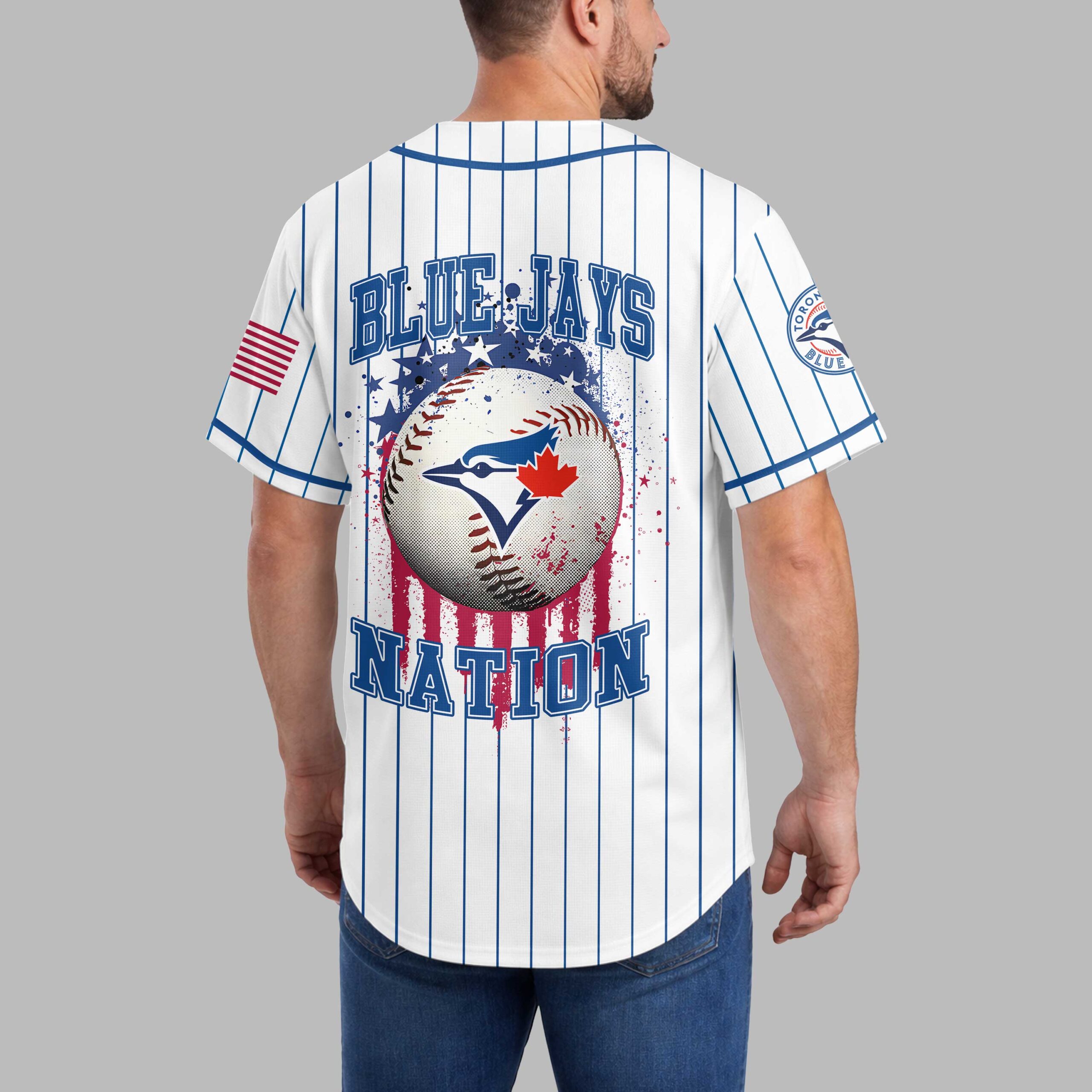 Show your unwavering spirit for the game with this unique Blue Jays Nation baseball jersey. Merging classic baseball aesthetics with a patriotic flair, it’s perfect for fans who want to stand out and celebrate their passion. The crisp white jersey features bold blue pinstripes and the iconic ‘BLUE JAYS’ lettering across the front, with a stars and stripes pattern. The back showcases a distressed ‘BLUE JAYS’ above a striking baseball graphic, adorned with a red maple leaf and blue jay emblem, surrounded by a dynamic splash of stars and patriotic colors. ‘NATION’ boldly declares your allegiance below, with US flag details gracing both sleeves. This jersey is perfect for game days at the ballpark, watch parties, or any casual outing to showcase your baseball and patriotic pride. It’s an ideal choice for Memorial Day, July 4th celebrations, or simply to add sports style to your everyday wear.