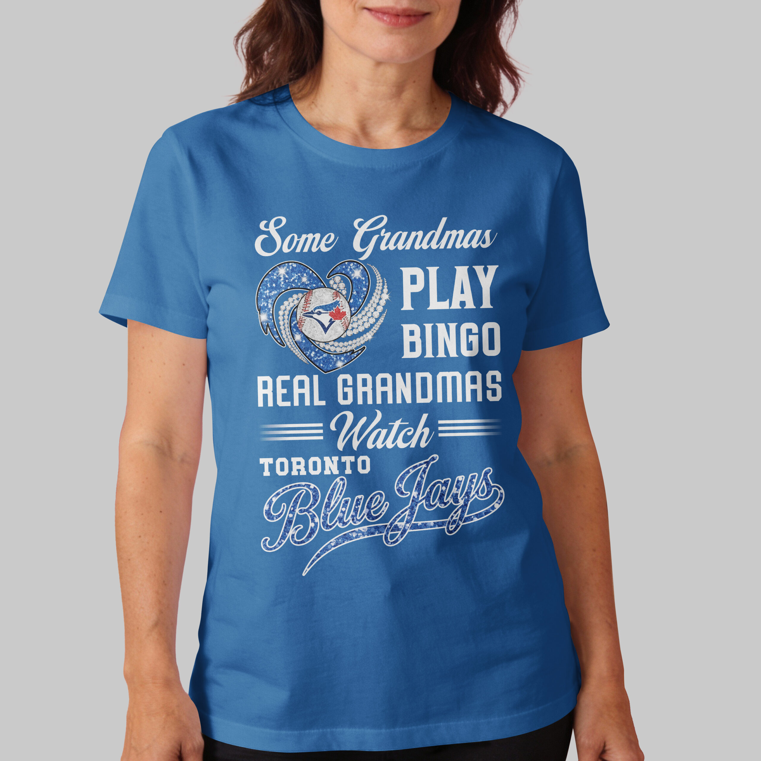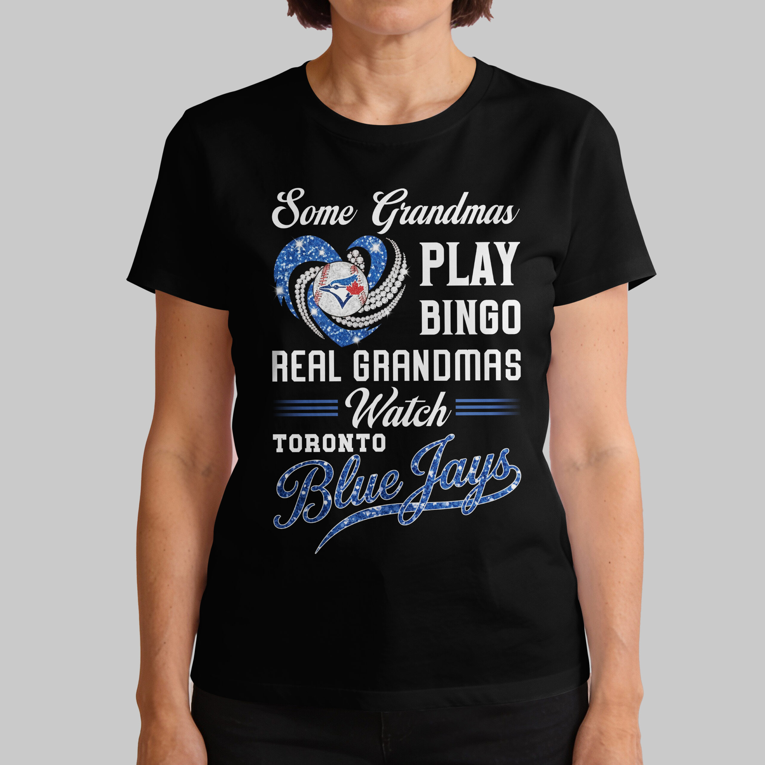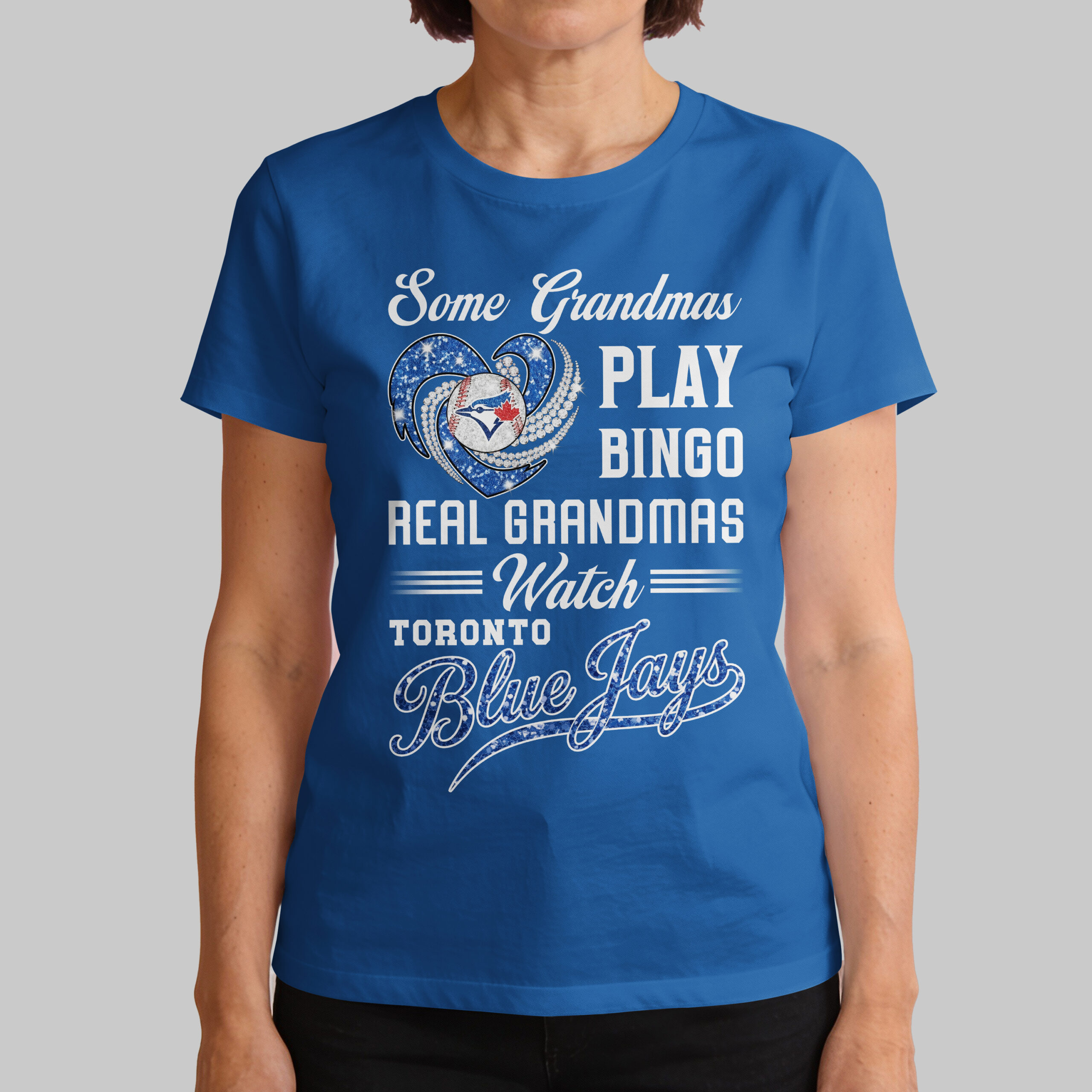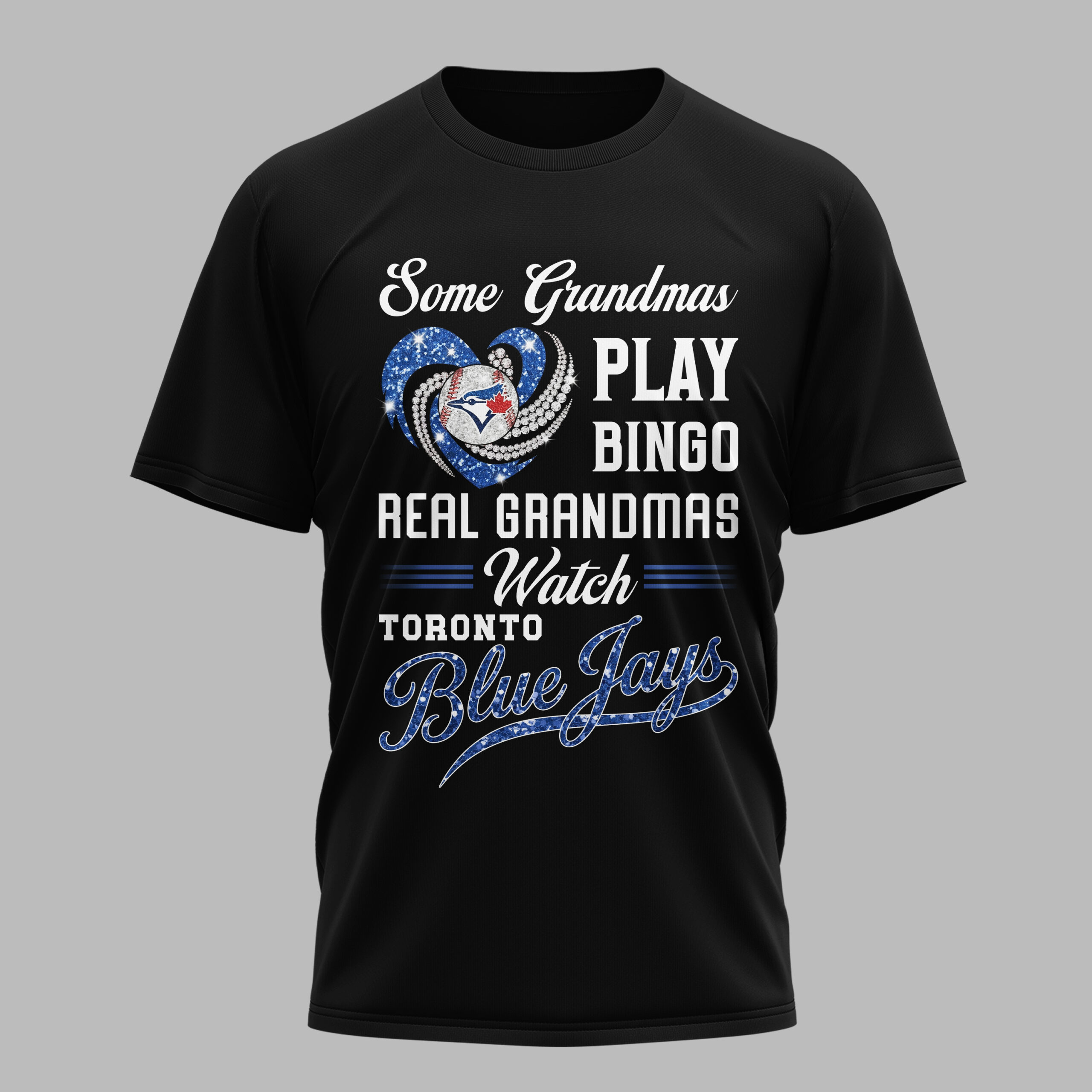 Show your Toronto Blue Jays pride with this fun Grandma T-shirt! Perfect for grandmothers who trade bingo for thrilling baseball games. This tee celebrates grandmas who live and breathe Blue Jays, showcasing their passion and unwavering team spirit. The design features a dazzling blue glitter heart, accented with diamond-like details, embracing a baseball with the iconic Toronto Blue Jays logo. Bold white lettering humorously proclaims, ‘Some Grandmas PLAY BINGO REAL GRANDMAS Watch TORONTO Blue Jays,’ with the ‘Blue Jays’ text shimmering, making your loyalty shine bright. This spirited tee is ideal for game days, cheering from home, or casual outings to proudly display your Toronto Blue Jays allegiance. It’s also a fantastic conversation starter at family gatherings, perfect for showing where your true dedication lies.