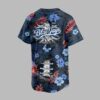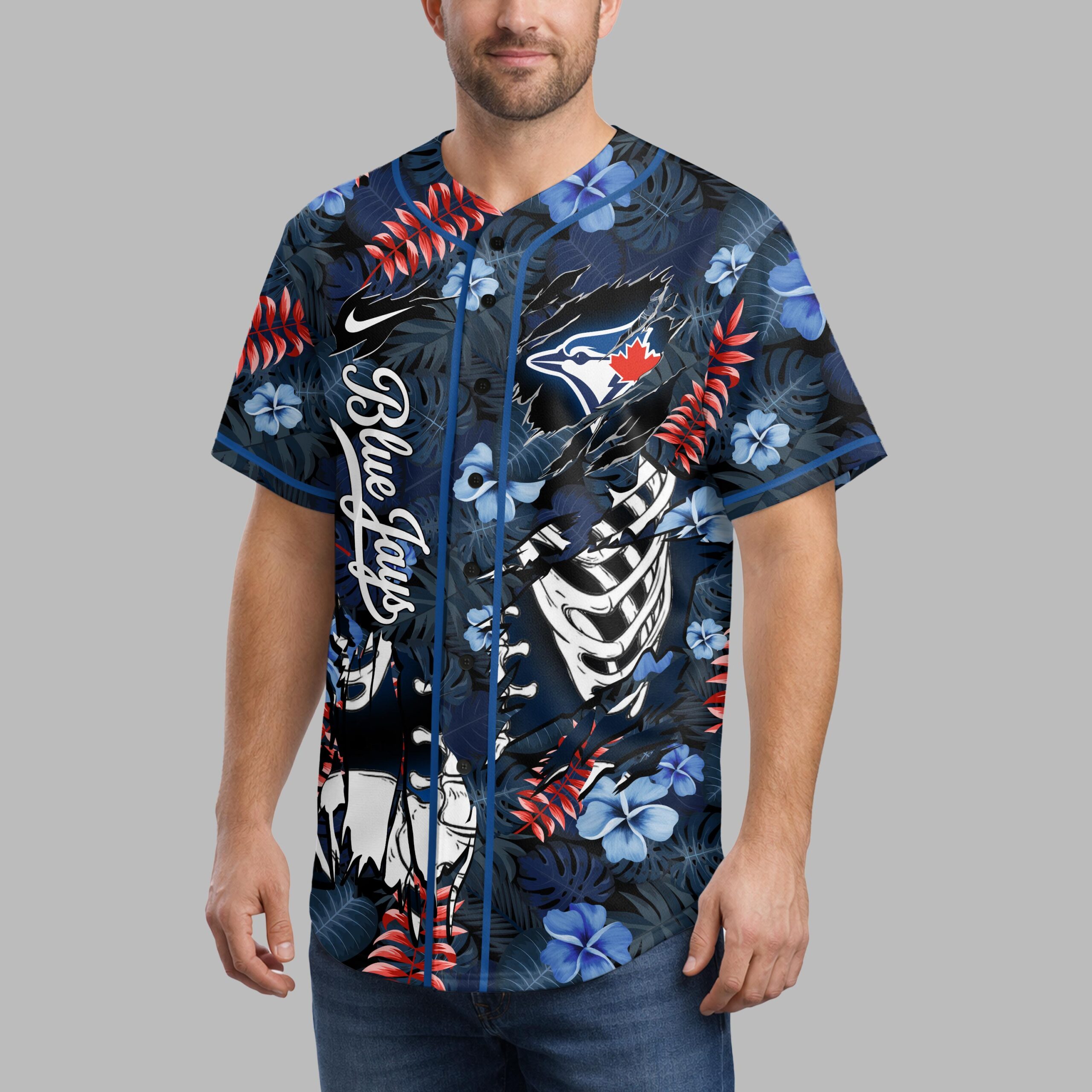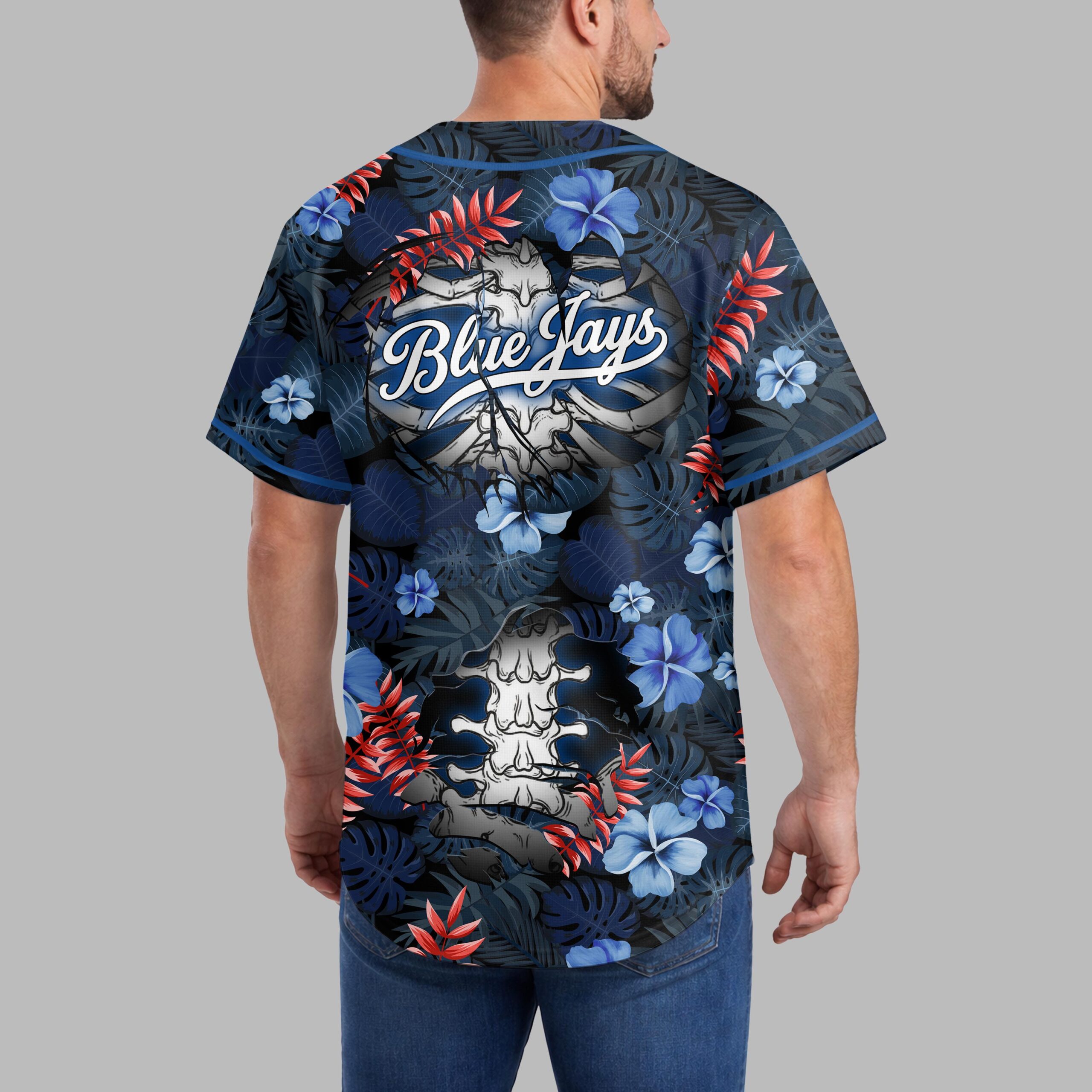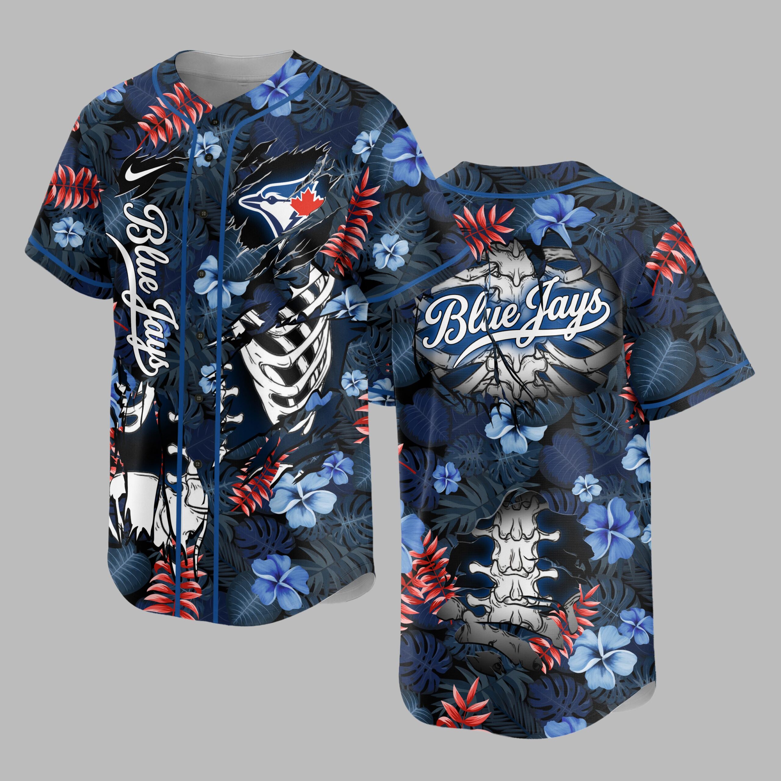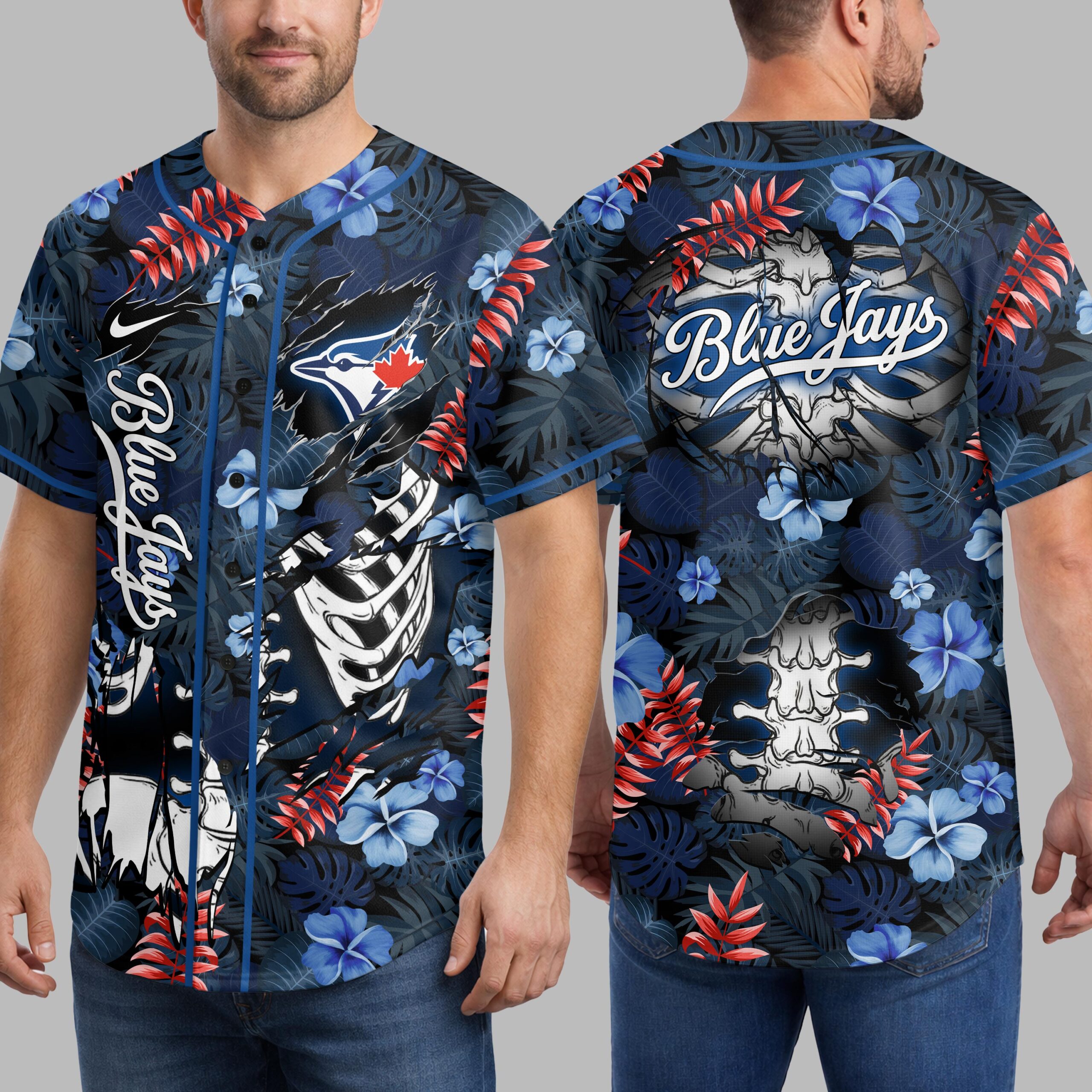 Unleash your Toronto Blue Jays spirit with a unique twist! This Hawaiian-style baseball jersey merges fierce team pride with a bold, tropical aesthetic. It’s perfect for fans ready to stand out and celebrate their fandom in style. The design features a deep blue tropical backdrop of lush leaves, vibrant blue hibiscus, and striking red ferns. An edgy skeleton motif is subtly integrated. On the front, Blue Jays appears vertically in white script, alongside the team logo and a Nike swoosh. The back showcases a prominent skeleton spine and ribs, crowned by Blue Jays text, completing the captivating tropical theme. Wear this jersey to the ballpark, a summer BBQ, or your next vacation. It’s ideal for infusing your love for the Blue Jays with a distinctive, fun style, making every outing a winning celebration.