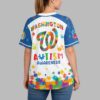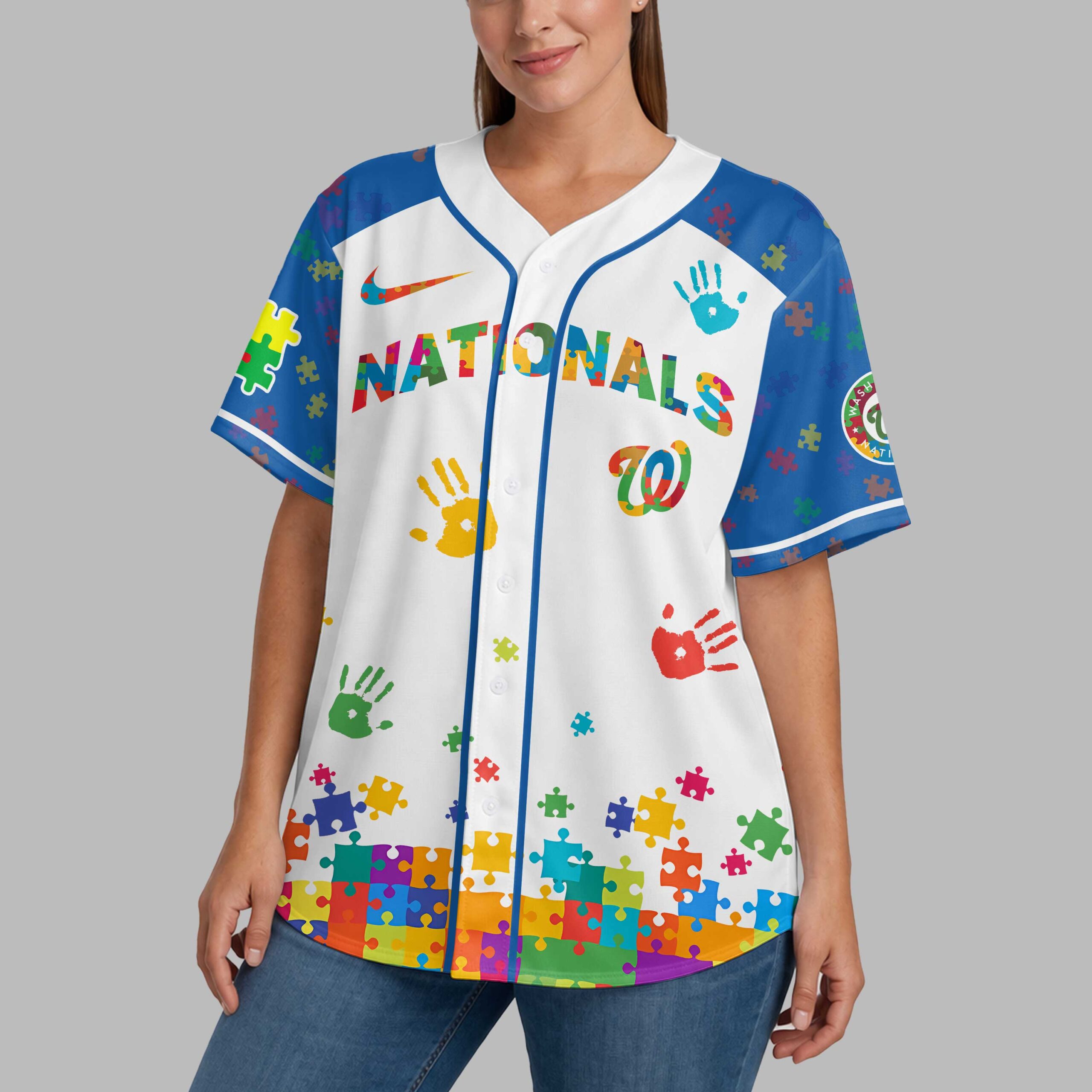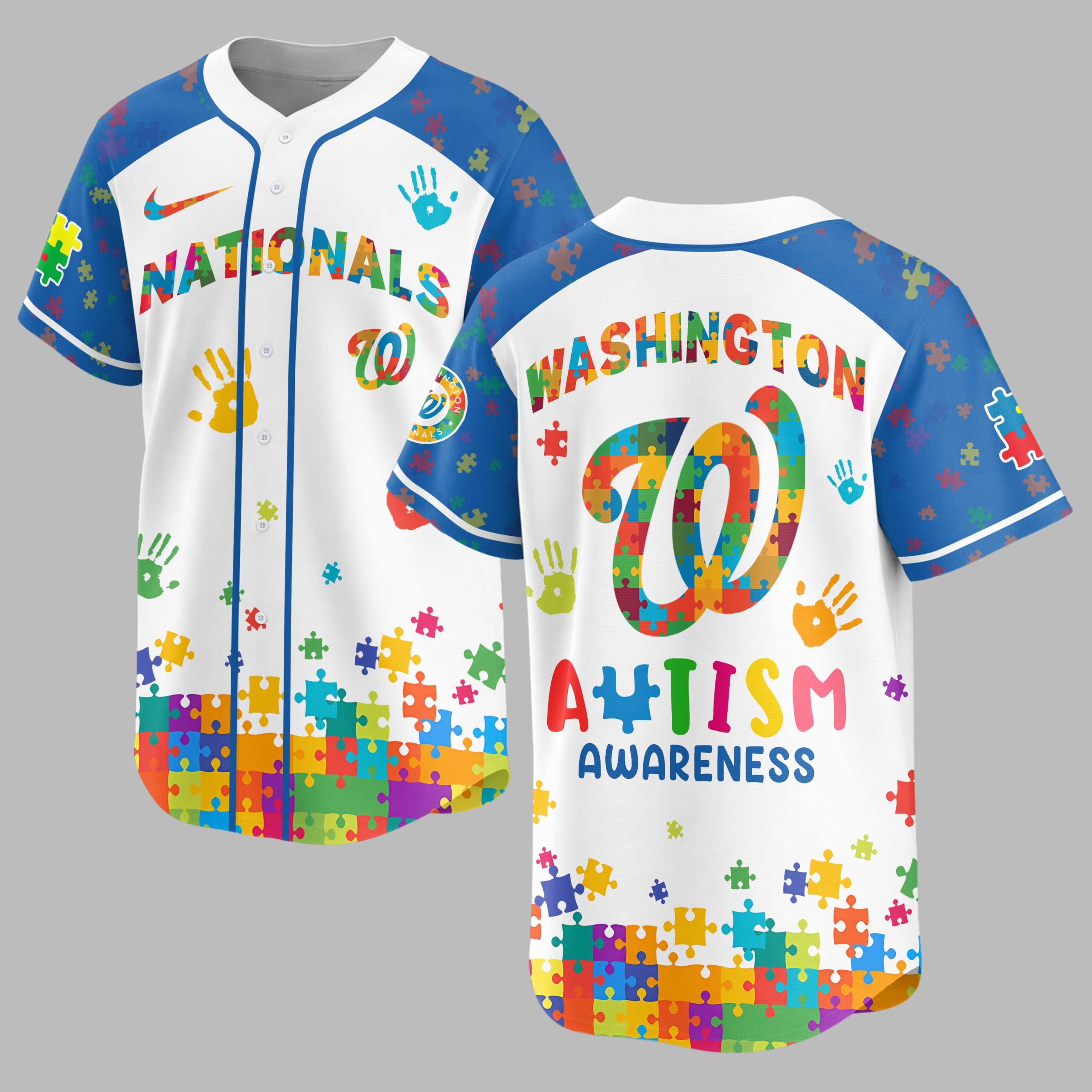 Show your unwavering support for the Washington Nationals and champion a vital cause with this special Autism Awareness jersey. It’s the perfect blend of team pride and a powerful message of inclusion, celebrating diversity. The front proudly displays NATIONALS and the iconic W logo, both vibrantly filled with multi-colored puzzle pieces. Colorful handprints and scattered puzzle shapes also adorn the white body and blue sleeves. The back features WASHINGTON and the W logo, along with AUTISM AWARENESS, uniquely using a puzzle piece for the ‘U’. Ideal for game days at Nationals Park, community events, or simply daily wear, this jersey lets you express both passion and compassion. It’s a bold statement designed to spark conversations and foster understanding.