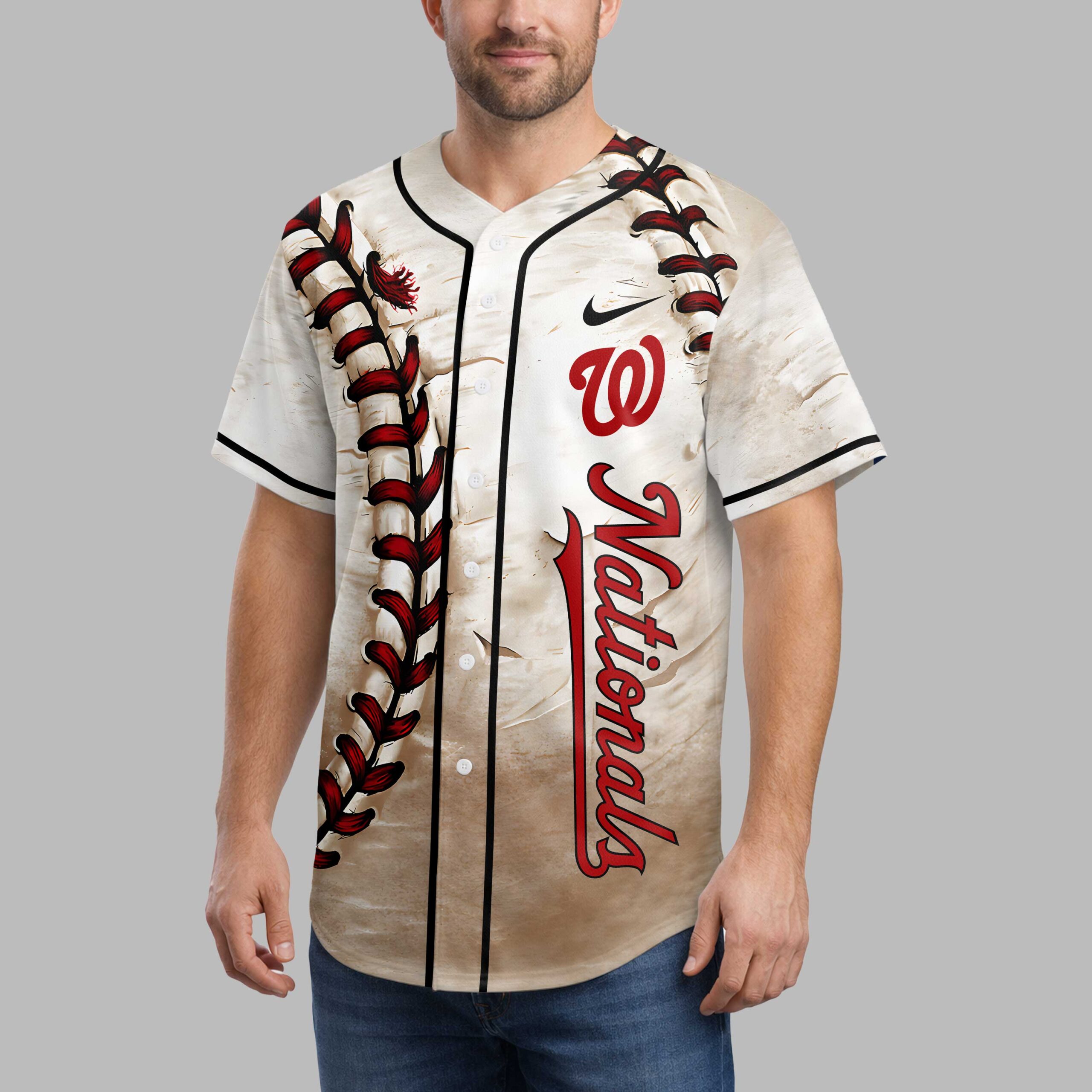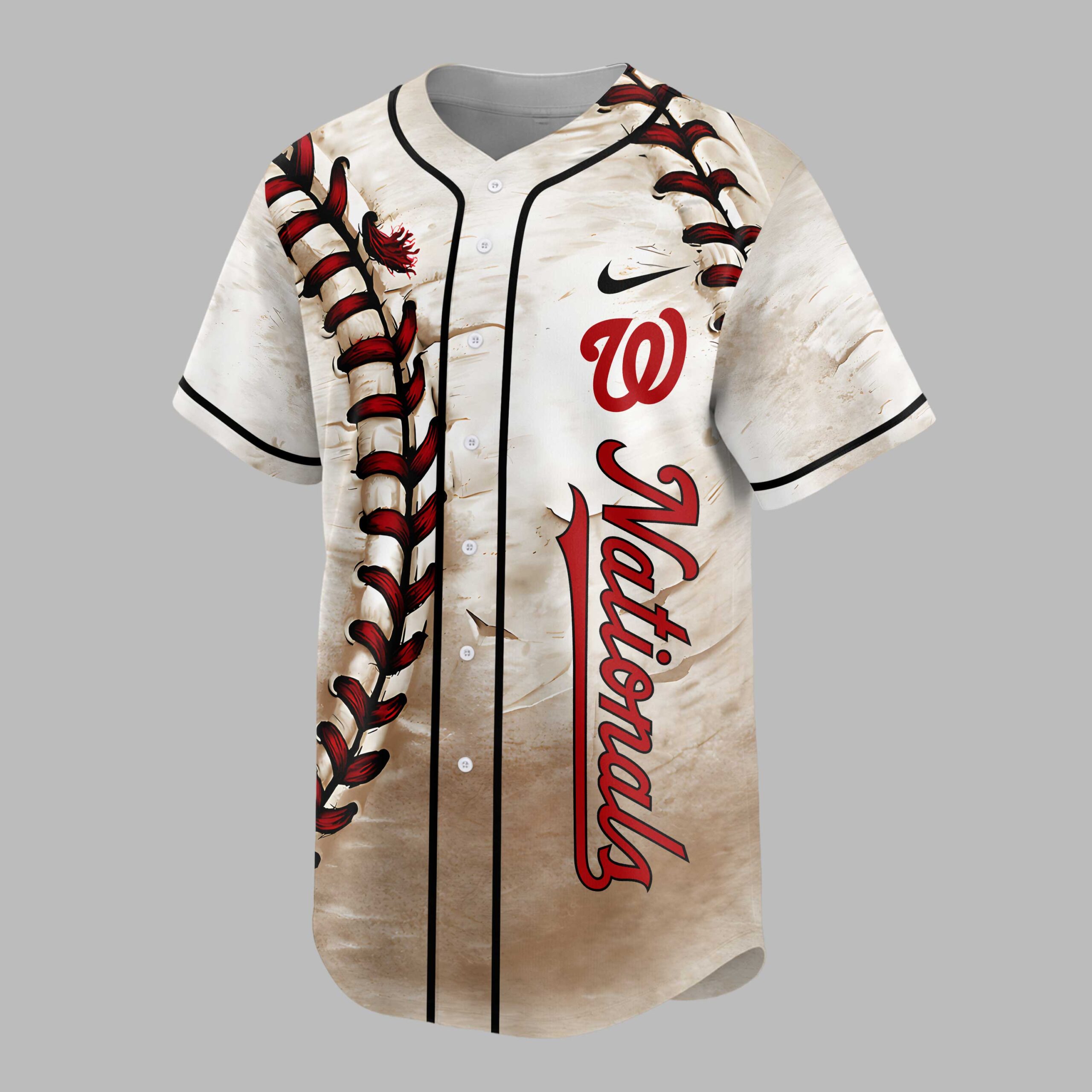 Show your unwavering support for the Washington Nationals with this unique, vintage-inspired baseball jersey! Designed for the ultimate fan, it blends classic style with modern personalization. Represent your team in authentic Nats pride, whether at the ballpark or cheering from home. The front features a striking distressed texture, mimicking a worn-in classic. A bold red baseball stitching design runs vertically, complementing the iconic red ‘W Nationals’ script logo and Nike swoosh. The customizable back proudly displays ‘Your Name’ in matching red script and your chosen numbers, uniquely styled with baseball stitching, all against a vintage backdrop. This personalized jersey is ideal for game day at Nationals Park, watch parties, or showcasing team spirit daily. It’s a fantastic choice for casual outings, sports events, or a thoughtful gift for any dedicated Nationals supporter. Wear your passion with pride!