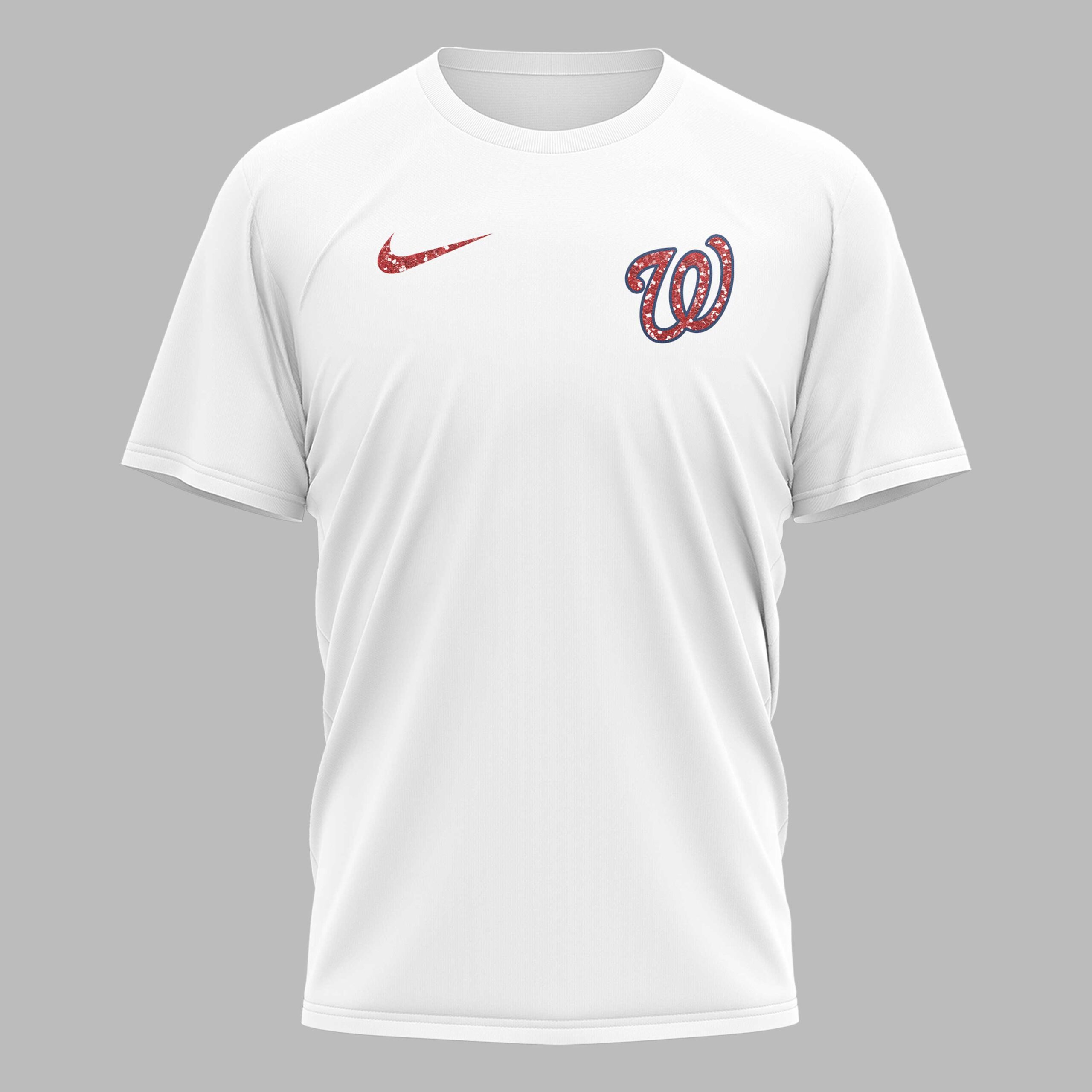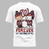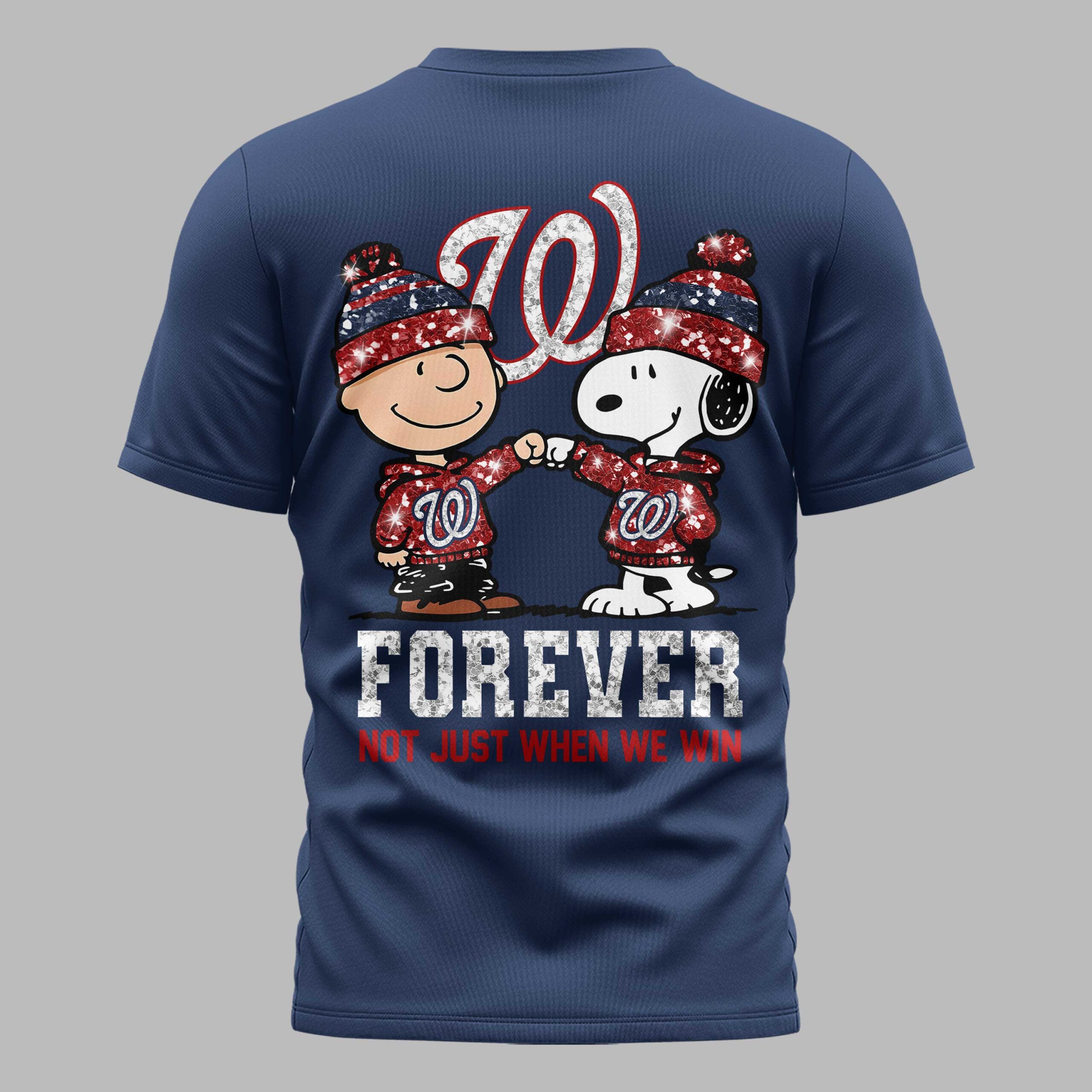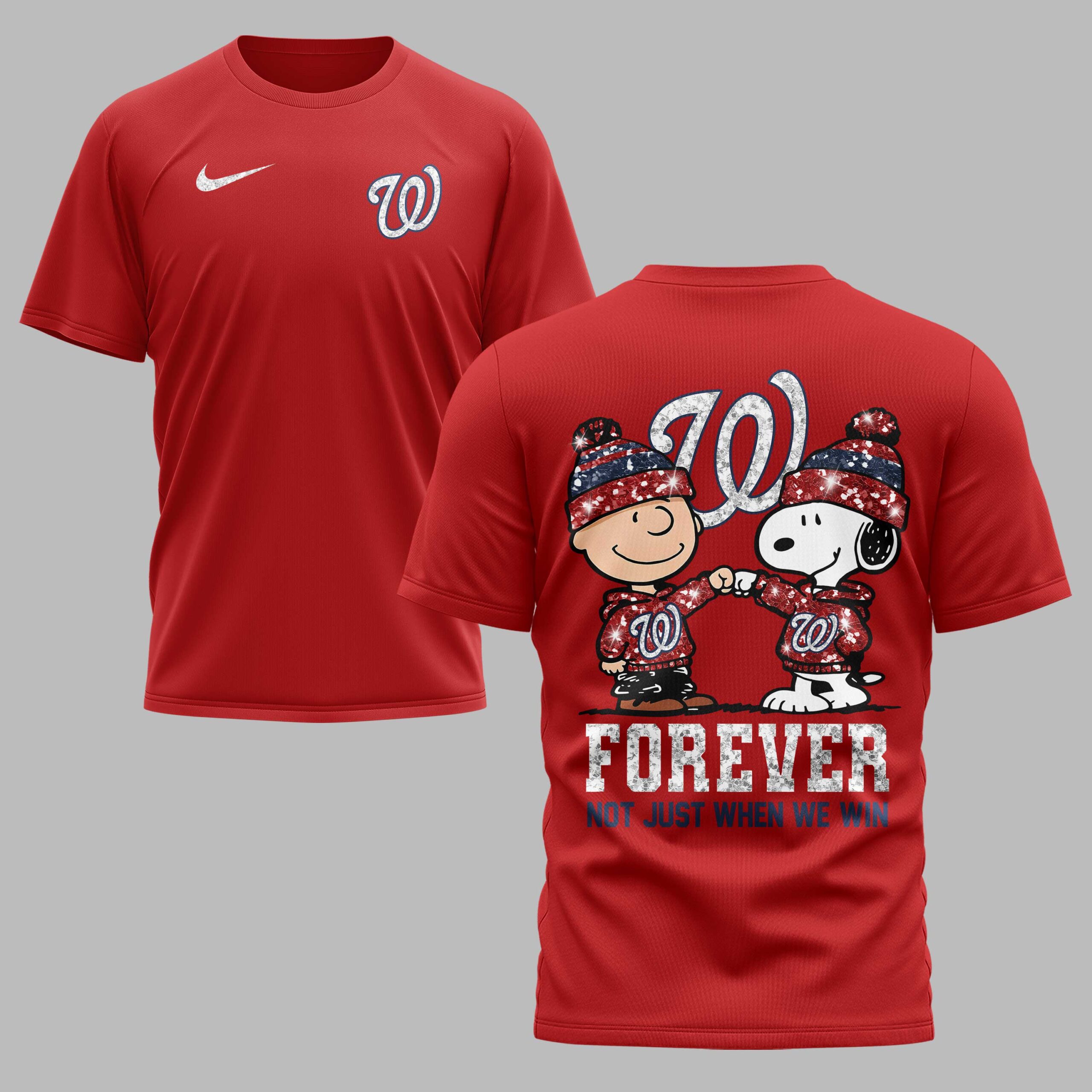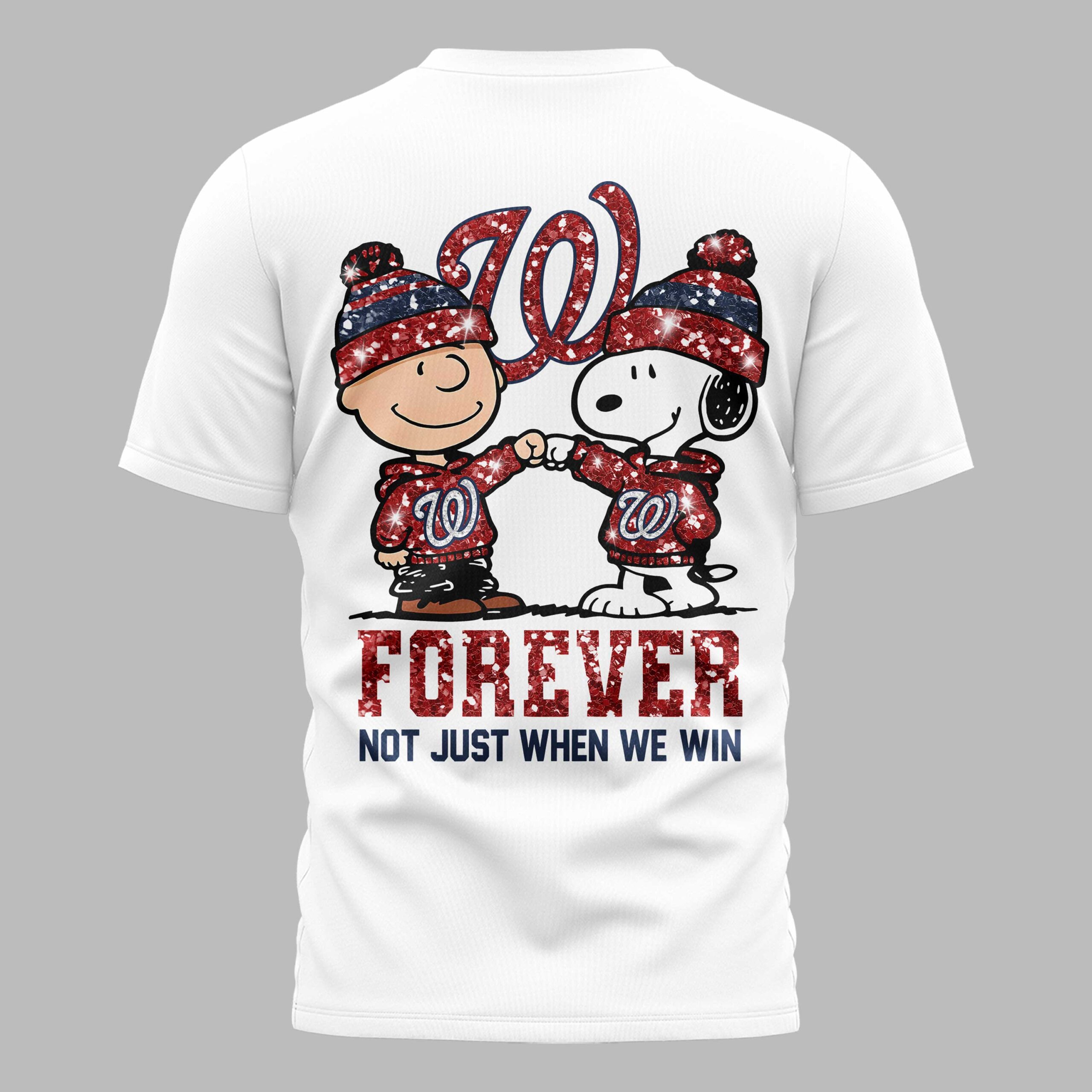 Showcase your undeniable loyalty to the Washington Nationals with this spirited and adorable Peanuts-themed fan T-shirt! It’s more than just a game day outfit; it’s a declaration of unwavering support, perfect for every devoted fan. The front of this bright white tee features a dazzling red glitter Nike swoosh on one side and the iconic Washington Nationals W logo, also in red glitter, on the other. The back brings the fun, starring Charlie Brown and Snoopy, both sporting festive red, white, and blue beanies and matching Nationals W hoodies, shaking hands in solidarity. Beneath them, the bold red glitter text declares FOREVER, accompanied by the powerful message, NOT JUST WHEN WE WIN, in coordinating blue. This T-shirt is ideal for cheering on the Nationals at the ballpark, gathering with friends for a watch party, or simply expressing your team pride on any casual day. It’s a heartwarming and stylish way to celebrate your favorite team and beloved Peanuts characters.
