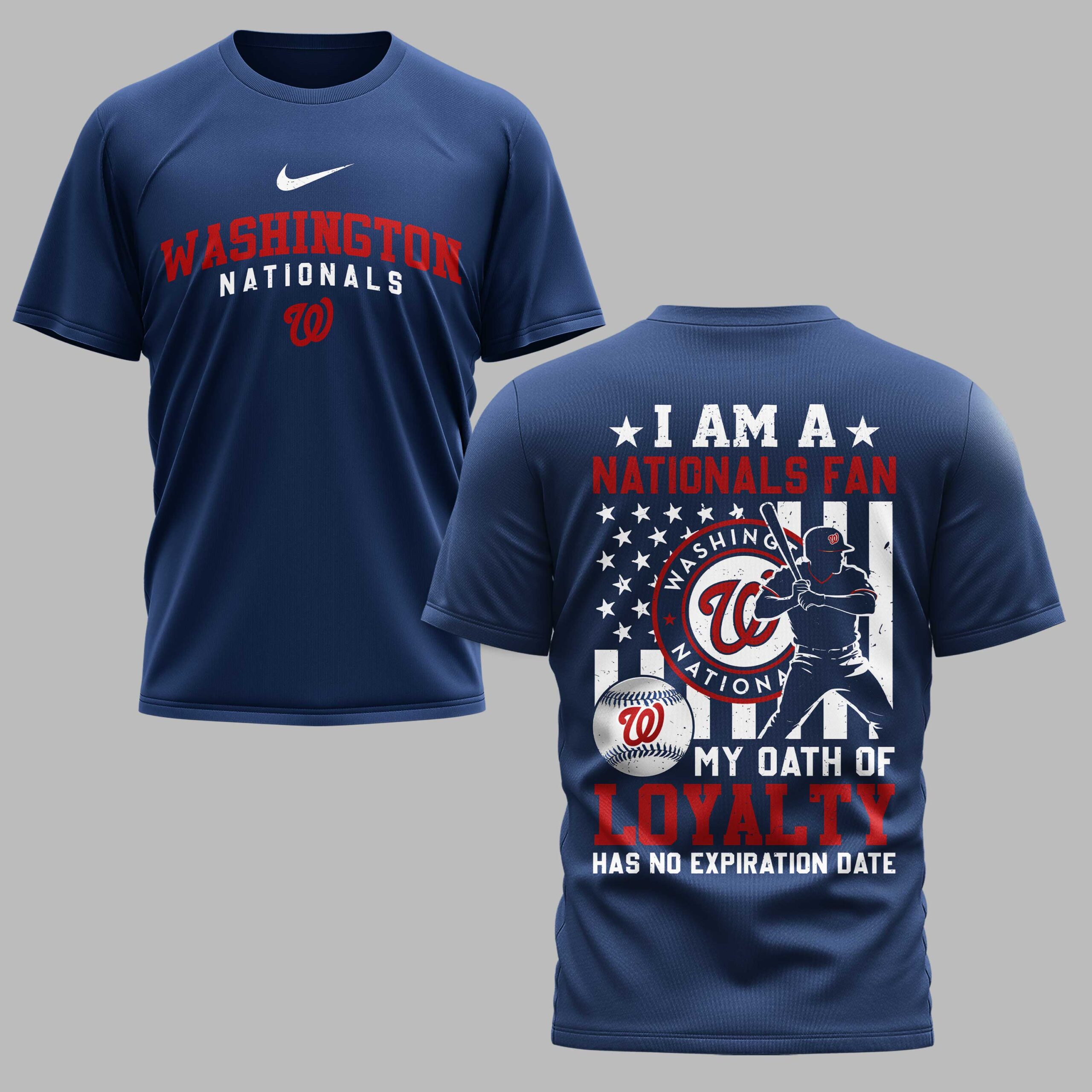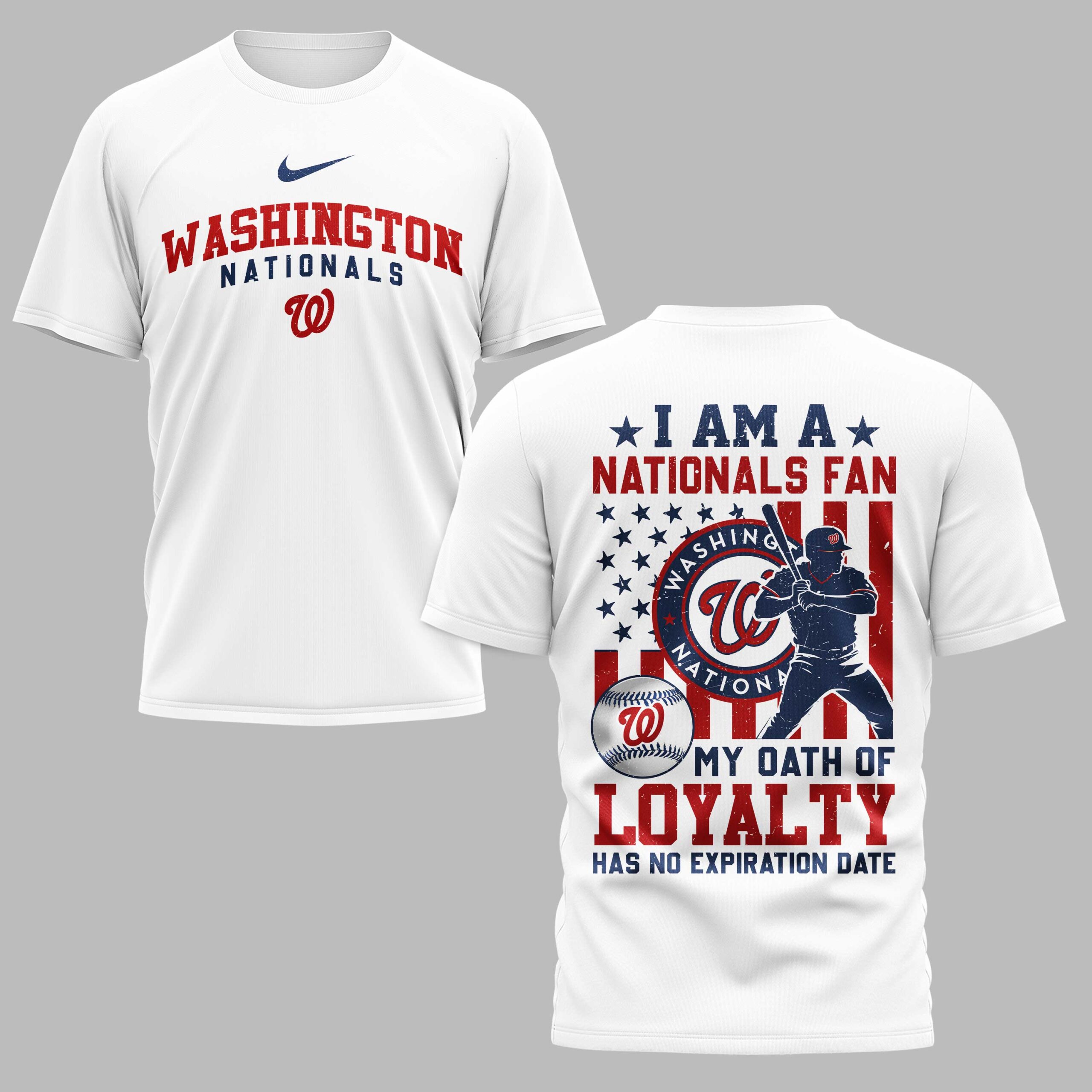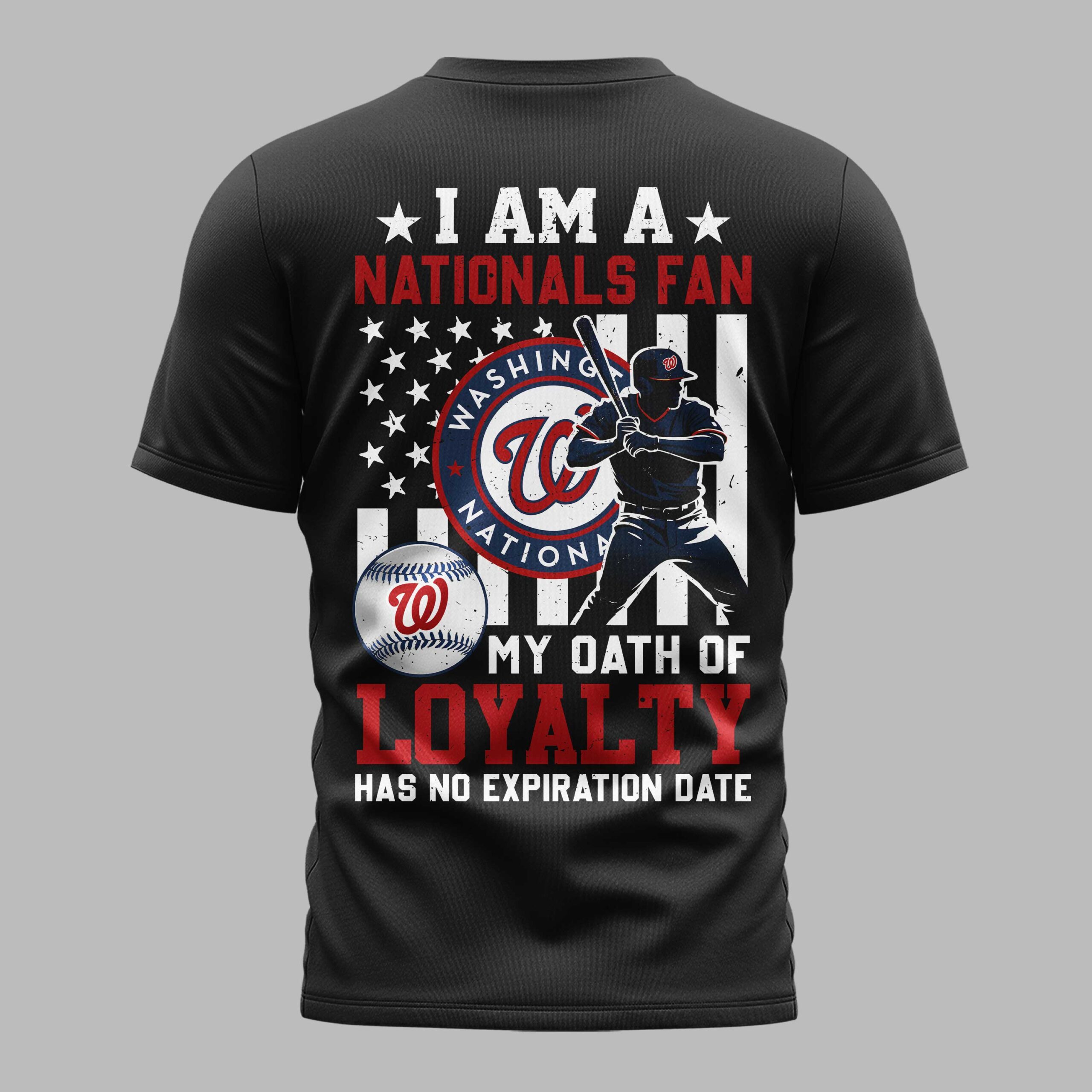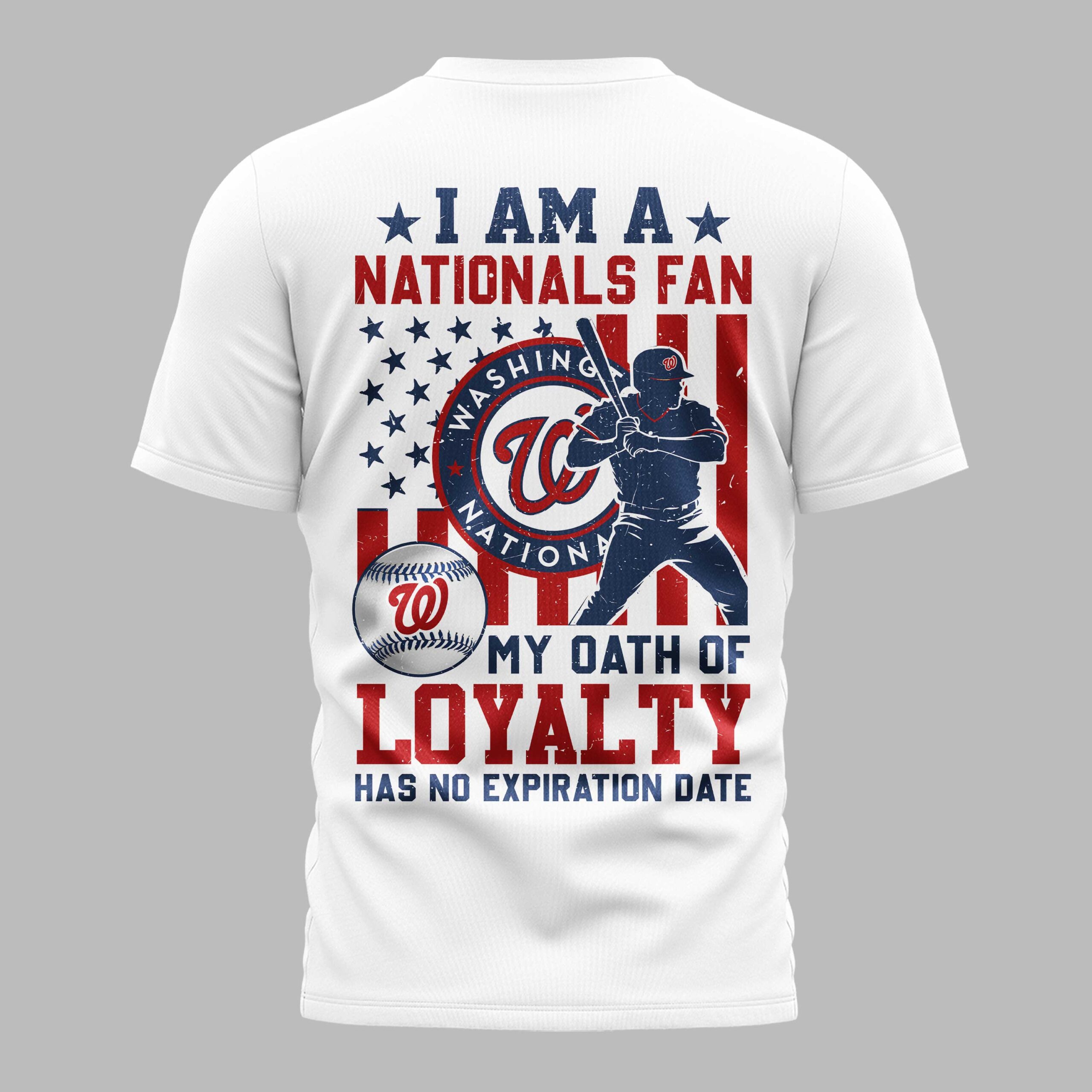 Show your unwavering allegiance to the Washington Nationals with this dynamic baseball tee! Perfect for the dedicated fan, this shirt proudly displays your team spirit and commitment, celebrating every hit, every inning, and every victory with a bold declaration of loyalty. The front features WASHINGTON NATIONALS in striking red and white lettering, accompanied by the iconic W logo. Turn around and the back reveals an impressive design: a distressed American flag backdrop frames a powerful silhouette of a batter in action, alongside the circular WASHINGTON NATIONALS emblem and a baseball. Below, the powerful statement MY OATH OF LOYALTY HAS NO EXPIRATION DATE leaves no doubt where your heart lies. Whether you’re cheering from the stands, watching at home with friends, or simply going about your day, this tee is a standout piece for any Nationals fan. It’s the ideal way to showcase your love for the team and your patriotic pride, making it a go-to choice for game days, casual outings, or any occasion where you want to wear your fan loyalty on full display.