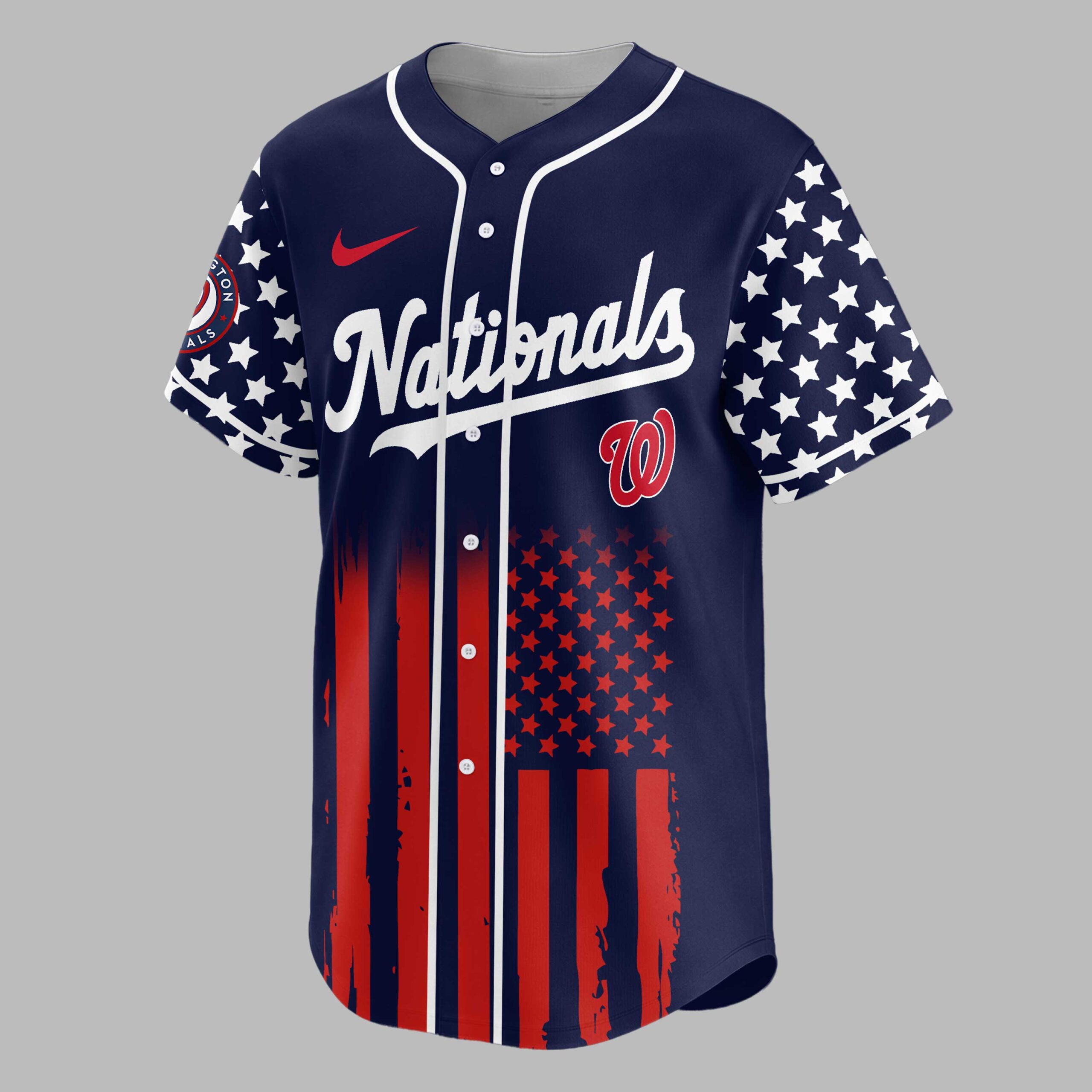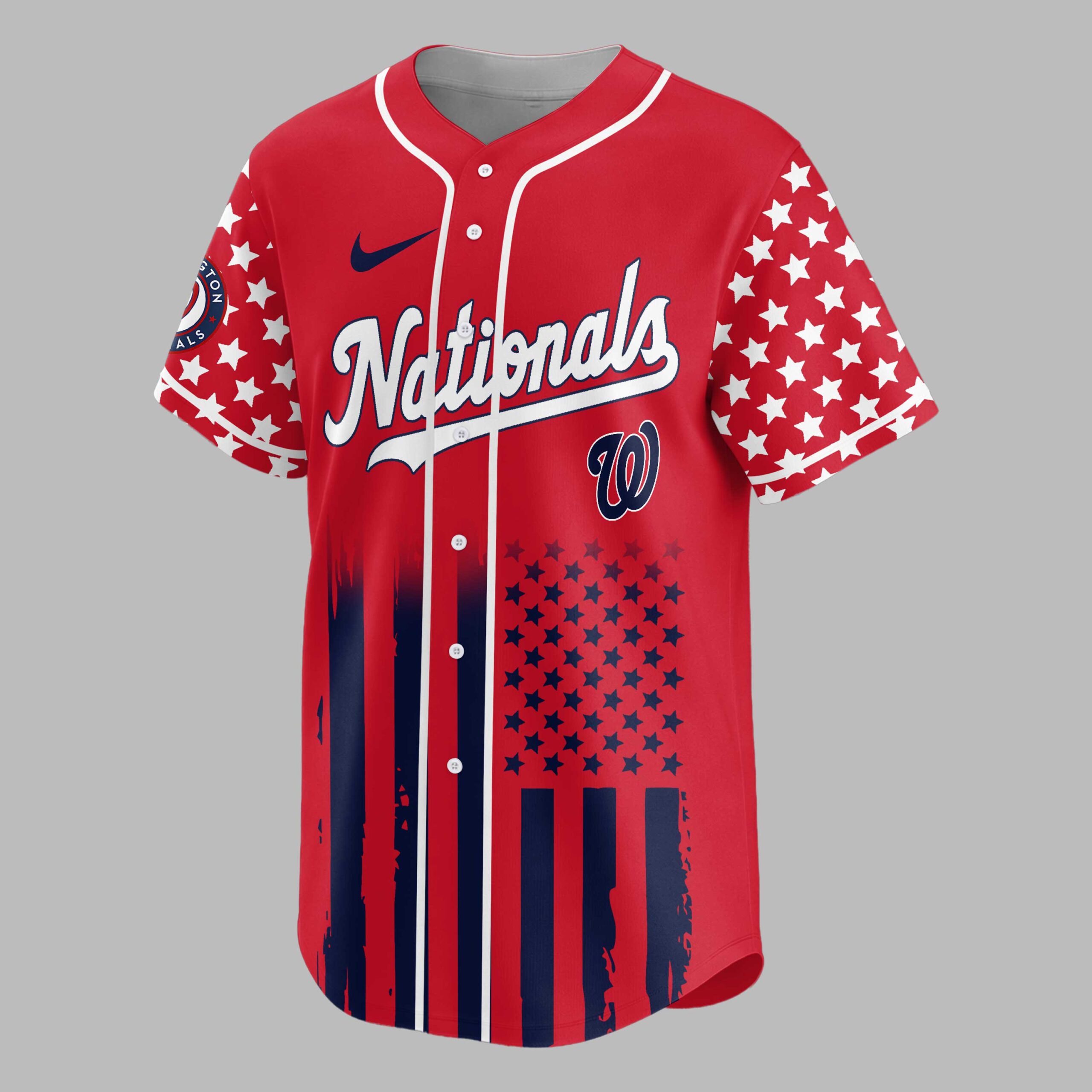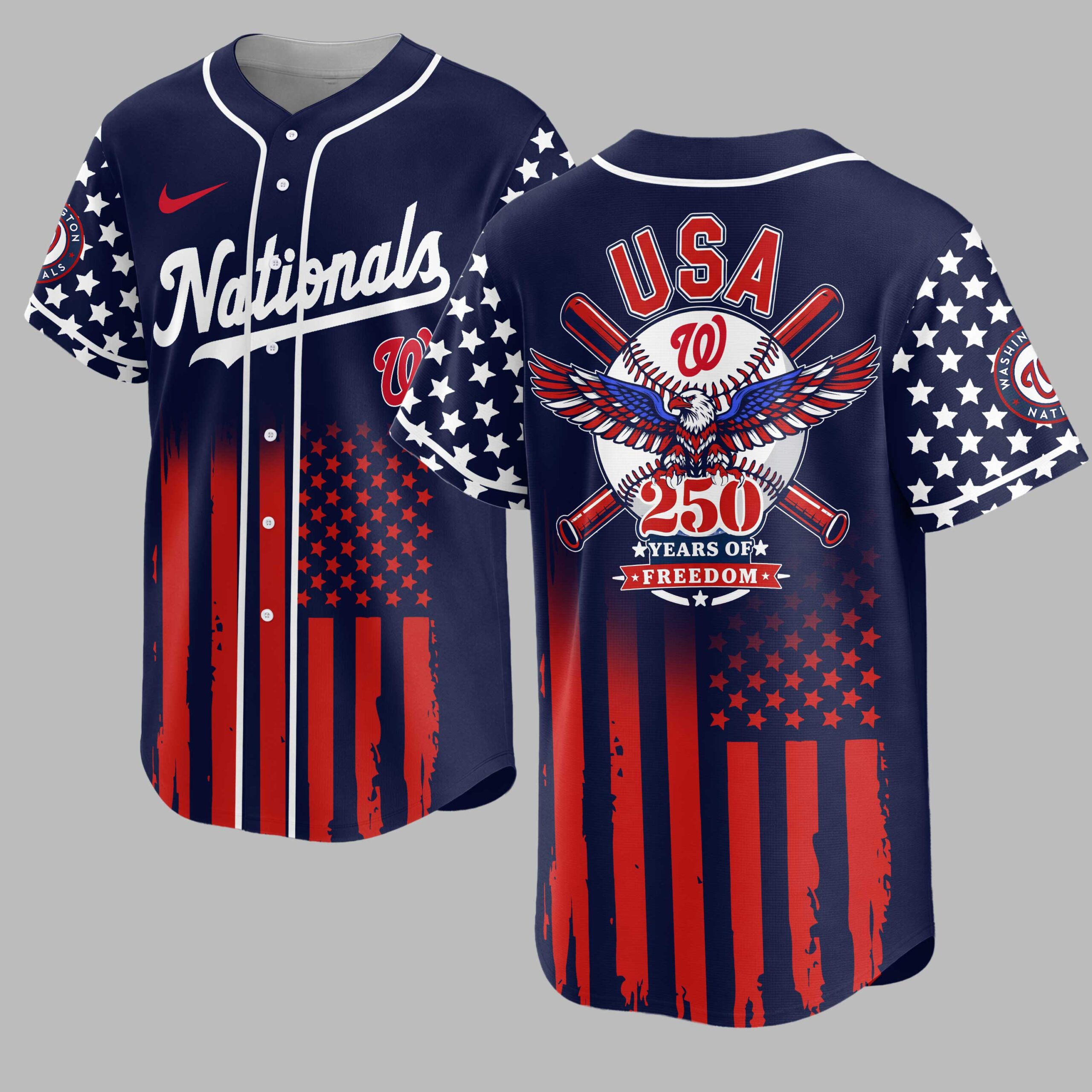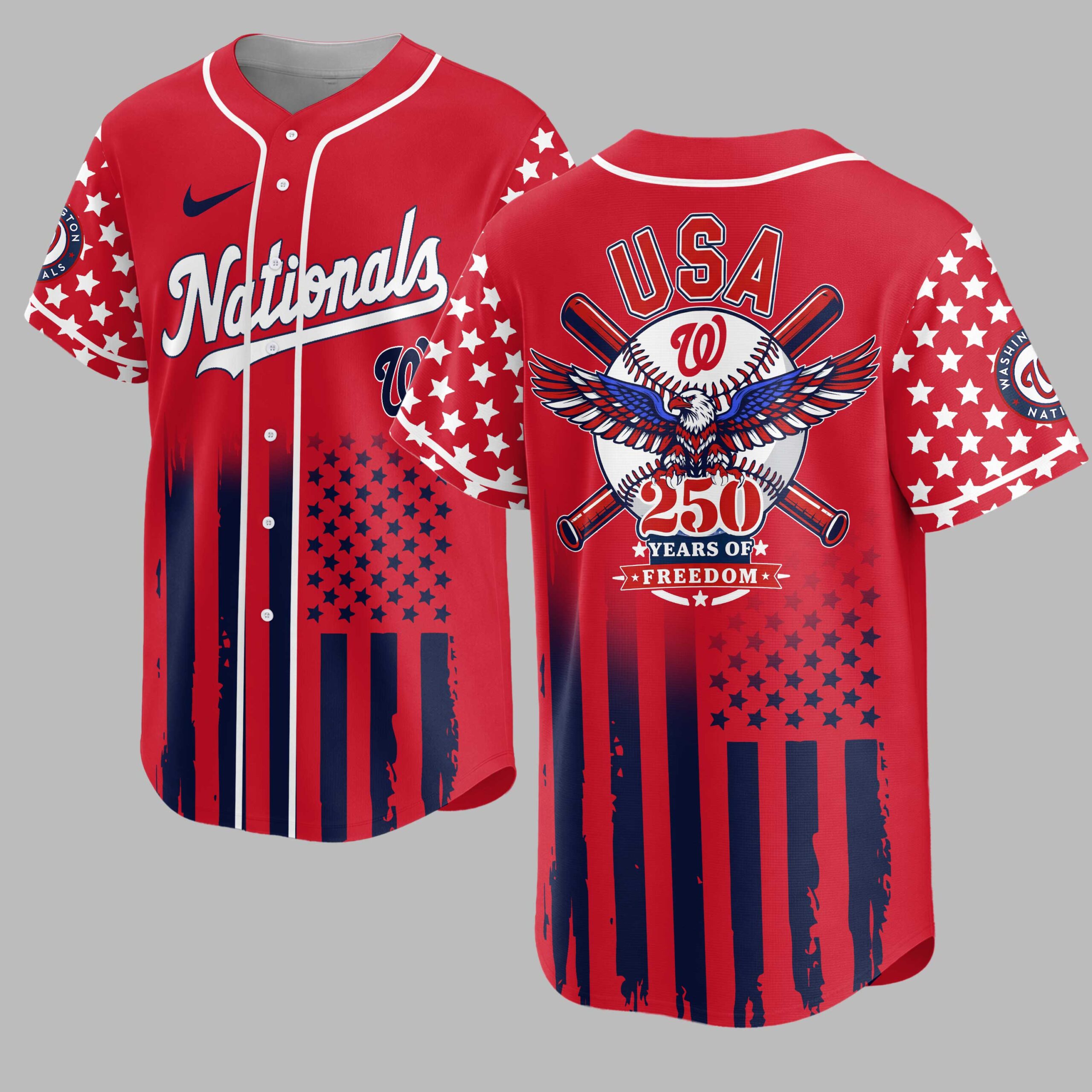 Celebrate both America’s enduring spirit and your Washington Nationals pride with this dynamic baseball jersey! This exclusive design perfectly blends your love for the game and the nation, making it a must-have for any fan who cherishes freedom and fantastic baseball. The front proudly displays Nationals in classic script alongside the iconic W logo, subtly accented with stars and a distressed flag pattern at the bottom. Turn heads with the back featuring a powerful USA graphic, a baseball with the Nationals W, crossed bats, and a majestic red, white, and blue eagle, all commemorating 250 Years of Freedom over a striking stars and stripes background. Perfect for cheering on the Nationals at the ballpark, celebrating patriotic holidays like the Fourth of July, or simply showcasing your American and team spirit anywhere you go. This jersey is designed for those who wear their pride boldly and with passion.