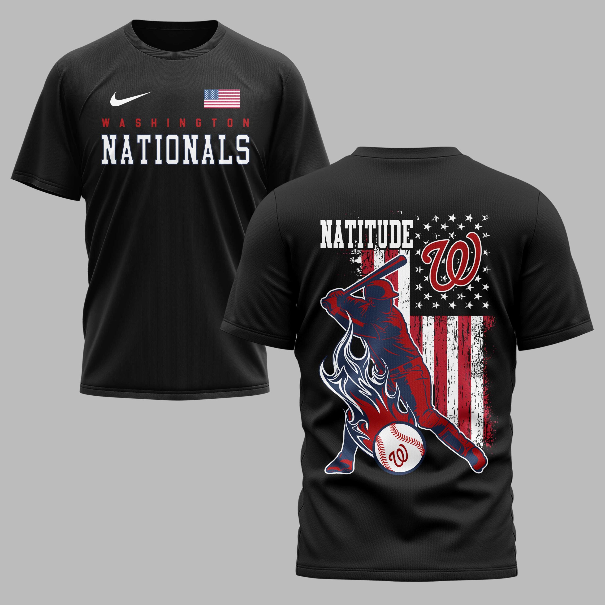 Ignite your passion for the Washington Nationals with this dynamic tee, perfect for showcasing your Natitude with pride! This shirt embodies the spirited energy of game day, blending your love for baseball with a bold, patriotic flair. Stand out from the crowd and let everyone know where your loyalties lie, celebrating every home run and stellar play. The front proudly displays WASHINGTON NATIONALS with a classic American flag, while a sleek Nike swoosh adds a touch of athletic style. The back is a true standout, featuring a striking silhouette of a batter mid-swing against a distressed American flag backdrop. White flames blaze around a baseball marked with the iconic W logo, all beneath the powerful statement NATITUDE and a larger team W emblem, creating an unforgettable design. Whether you’re cheering from the stands, gathering for a watch party, or simply out and about, this shirt is your go-to for showing unwavering Nationals support. It’s ideal for game days, casual outings, or any occasion where you want to express your team spirit and love for the nation’s capital team. Celebrate the Nationals and wear your Natitude loud and proud!