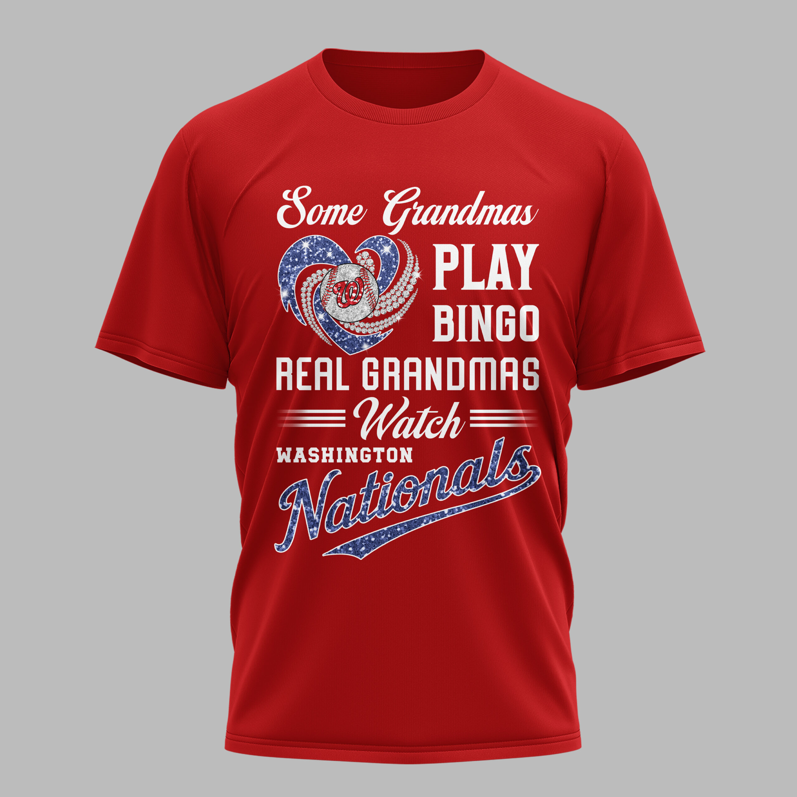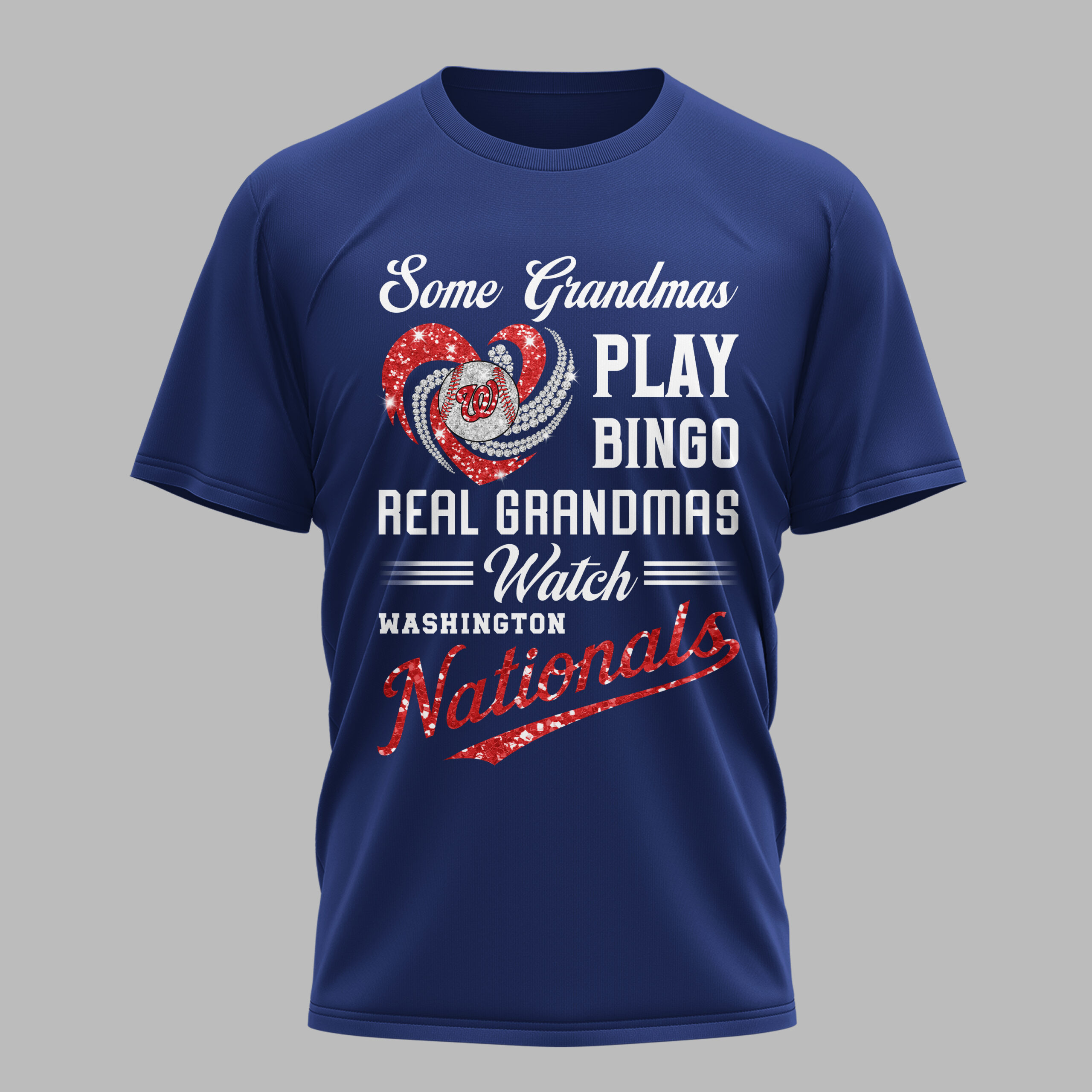 Show off your unwavering team spirit with this spirited Washington Nationals Grandma tee! Perfect for the proud grandma who knows that true gameday excitement beats bingo any day. This shirt is a loving tribute to the grandmas who live and breathe baseball, making it clear where their heart truly lies. Featuring the playful slogan Some Grandmas PLAY BINGO REAL GRANDMAS = Watch = WASHINGTON Nationals, the design captures attention with its sparkling blue and white glitter accents. A beautifully detailed baseball, emblazoned with the iconic W logo, sits within a heart-shaped swirl of patriotic glitter, radiating your love for the Nats. It’s a bold and fun way to celebrate your passion. Whether you’re cheering from the stands at Nationals Park, hosting a family watch party, or simply running errands around town, this shirt is your ultimate gameday essential. It’s a fantastic way to honor your role as a dedicated fan and a beloved grandma, making every day feel like a home run.