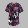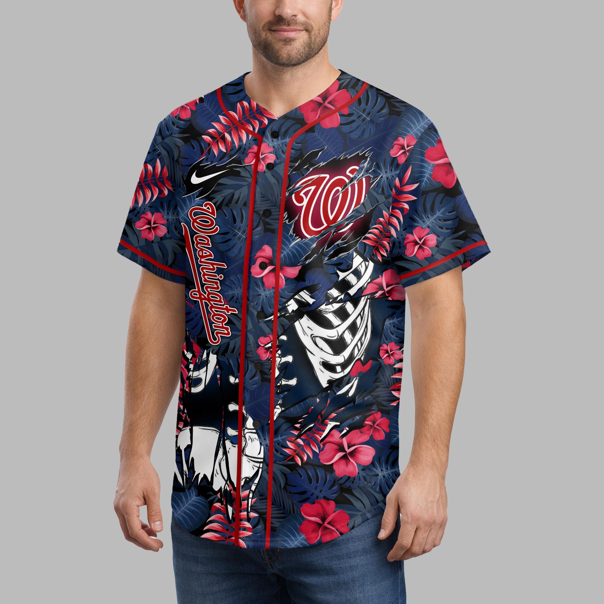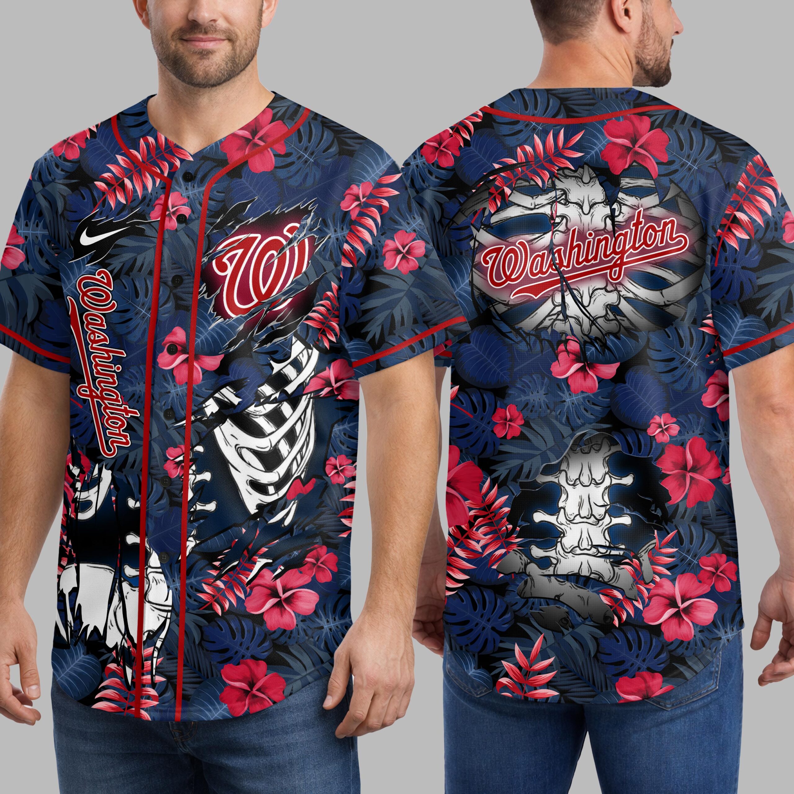 Unleash your ultimate fan spirit with this Washington Tropical Skeleton Baseball Jersey! Perfect for those who love their team and dare to stand out, this unique design blends classic team pride with an edgy, vacation-ready vibe. It’s more than just fan gear; it’s a statement piece that screams dedication with a dash of daring. The shirt features a vibrant dark blue tropical background adorned with lush blue leaves and striking red hibiscus flowers. On the front, Washington is boldly displayed vertically, complemented by the iconic W logo on the chest, all while a ripped effect dramatically reveals a skeleton torso. The back continues this captivating design, showcasing the team name and a spine-chilling skeleton, ensuring your fan loyalty is seen from every angle. Whether you’re catching a game at the ballpark, hosting a spirited watch party, or simply enjoying a summer day, this jersey is your go-to. It’s ideal for vacations, casual outings, or anytime you want to represent Washington in truly unforgettable style. Get ready to turn heads and celebrate your team with an attitude!
